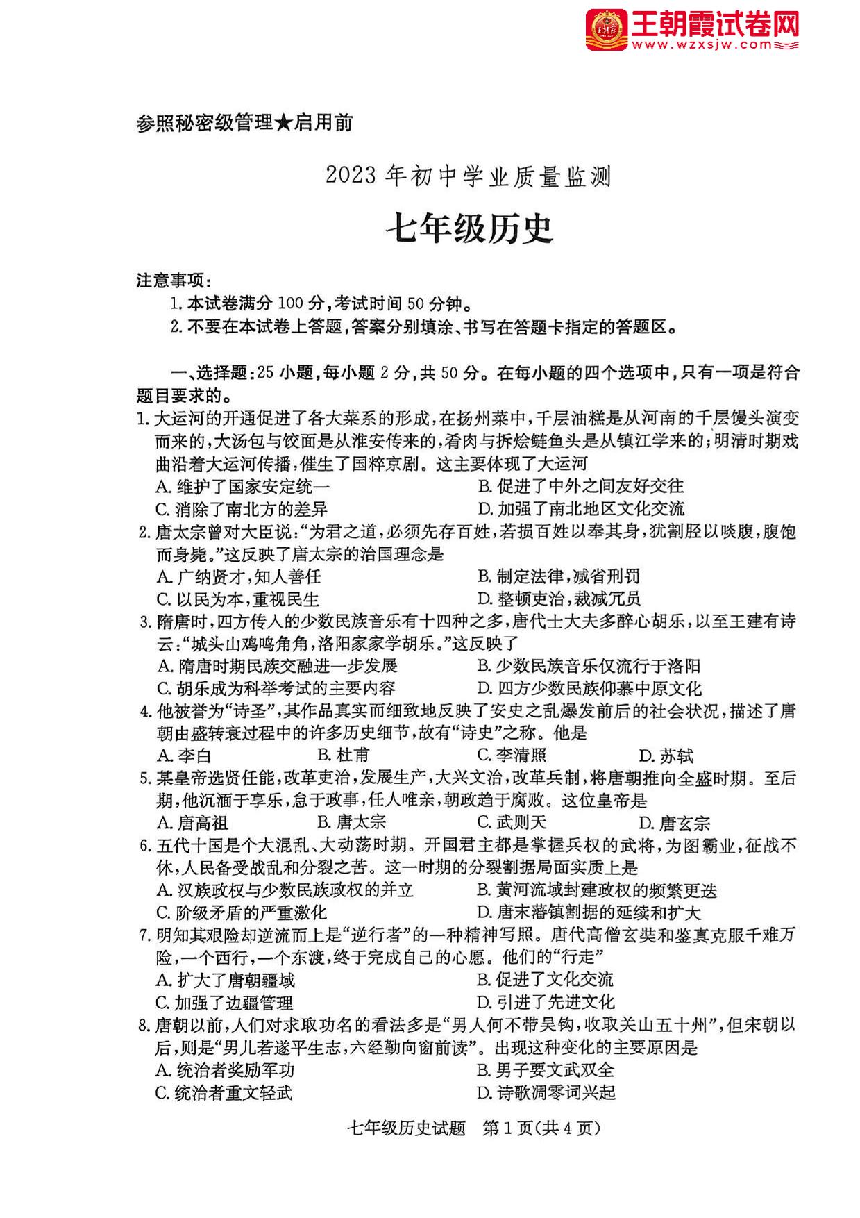 山东省枣庄市2022-2023学年下学期期末学业质量监测七年级历史(人教版)