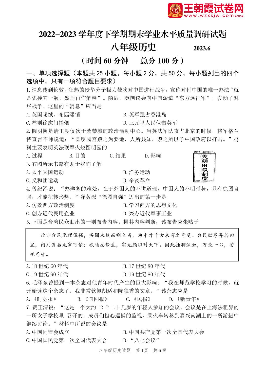 山东省临沂市罗庄区2022-2023学年度下学期期末学业水平质量调研试题八年级历史(人教版)