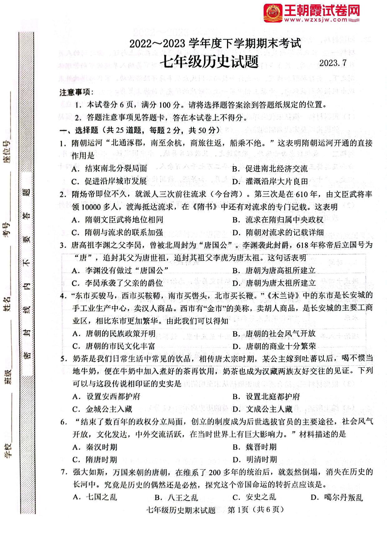 七年级历史人教版下册期末卷