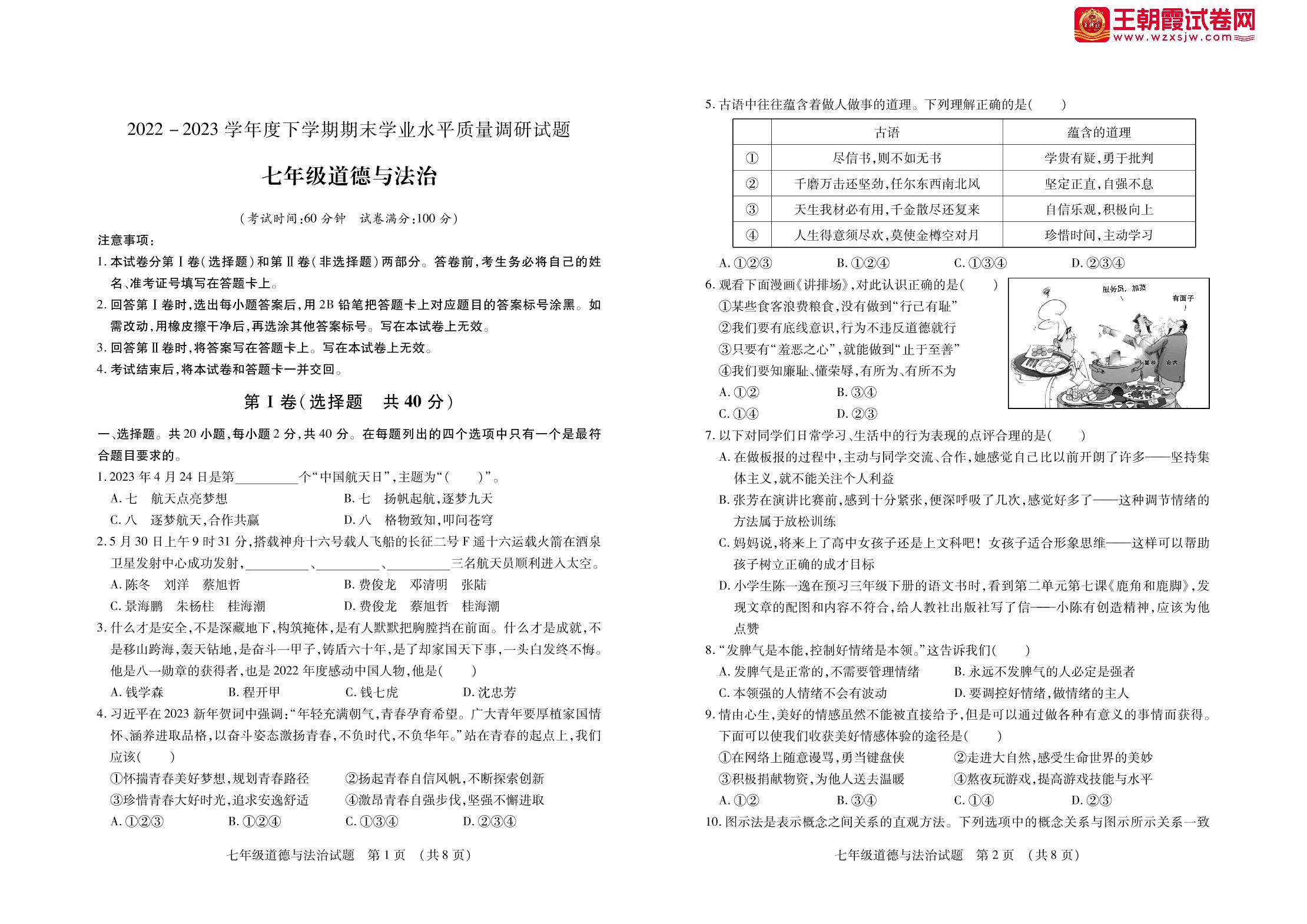 山东省临沂市河东区2022-2023学年度下学期期末学业水平检测调研试题七年级道德与法治(人教版)