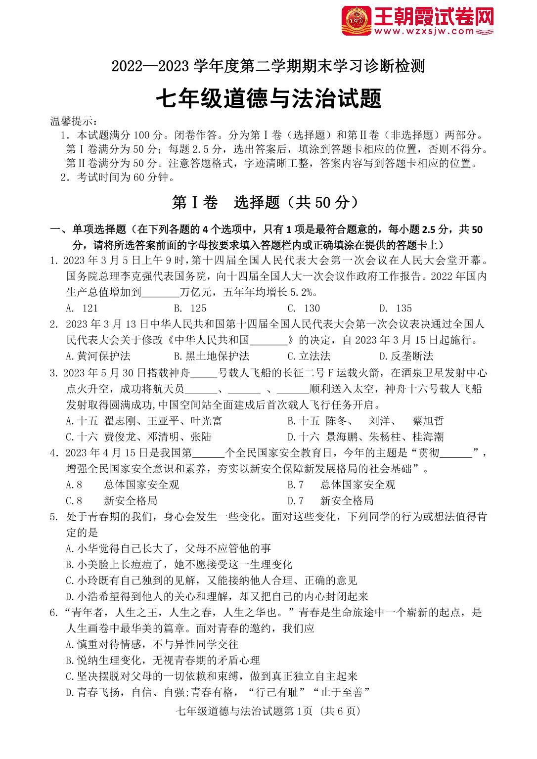 山东省济南市平阴县2022-2023学年度第二学期期末学习诊断检测七年级道德与法治(人教版)