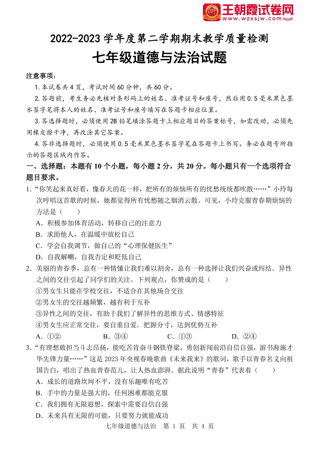 山东省济宁市鱼台县2022-2023学年度第二学期期末质量检测七年级道德与法治(人教版)