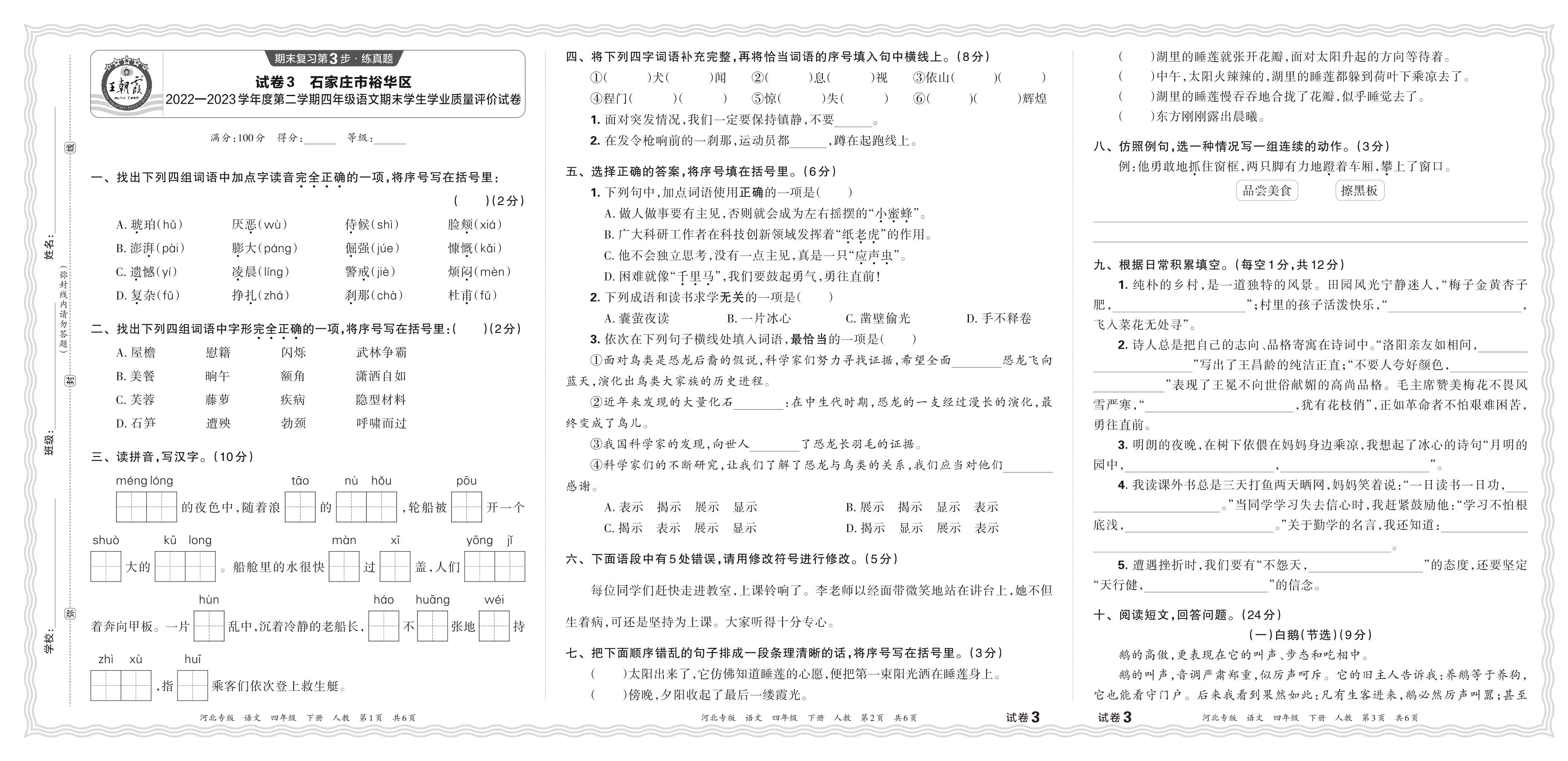 河北省石家庄市裕华区2022—2023学年度第二学期四年级语文期末学生学业质量评价试卷(人教版)【3】