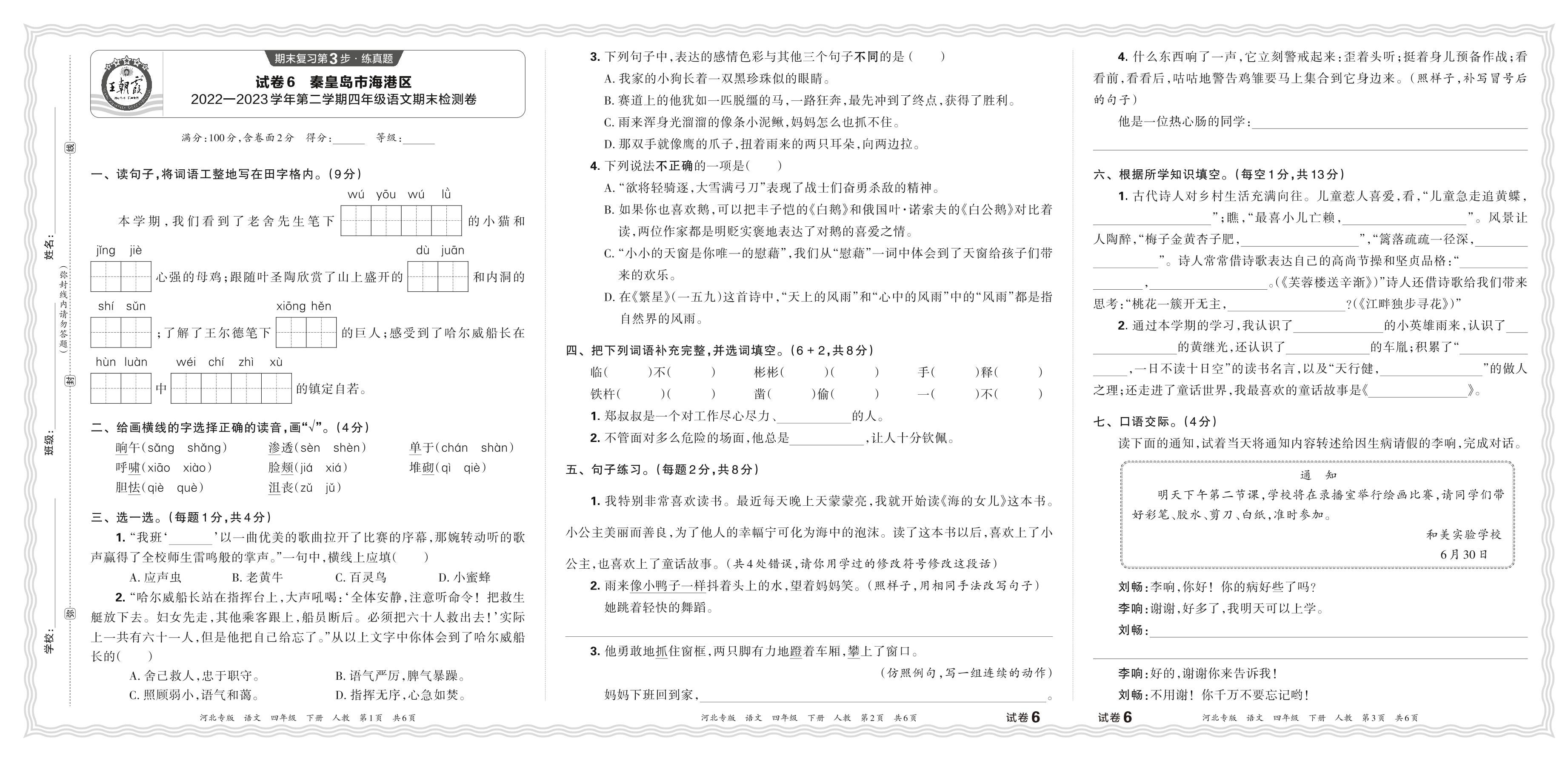 河北省秦皇岛市海港区2022—2023学年第二学期四年级语文期末检测卷(人教版)【6】