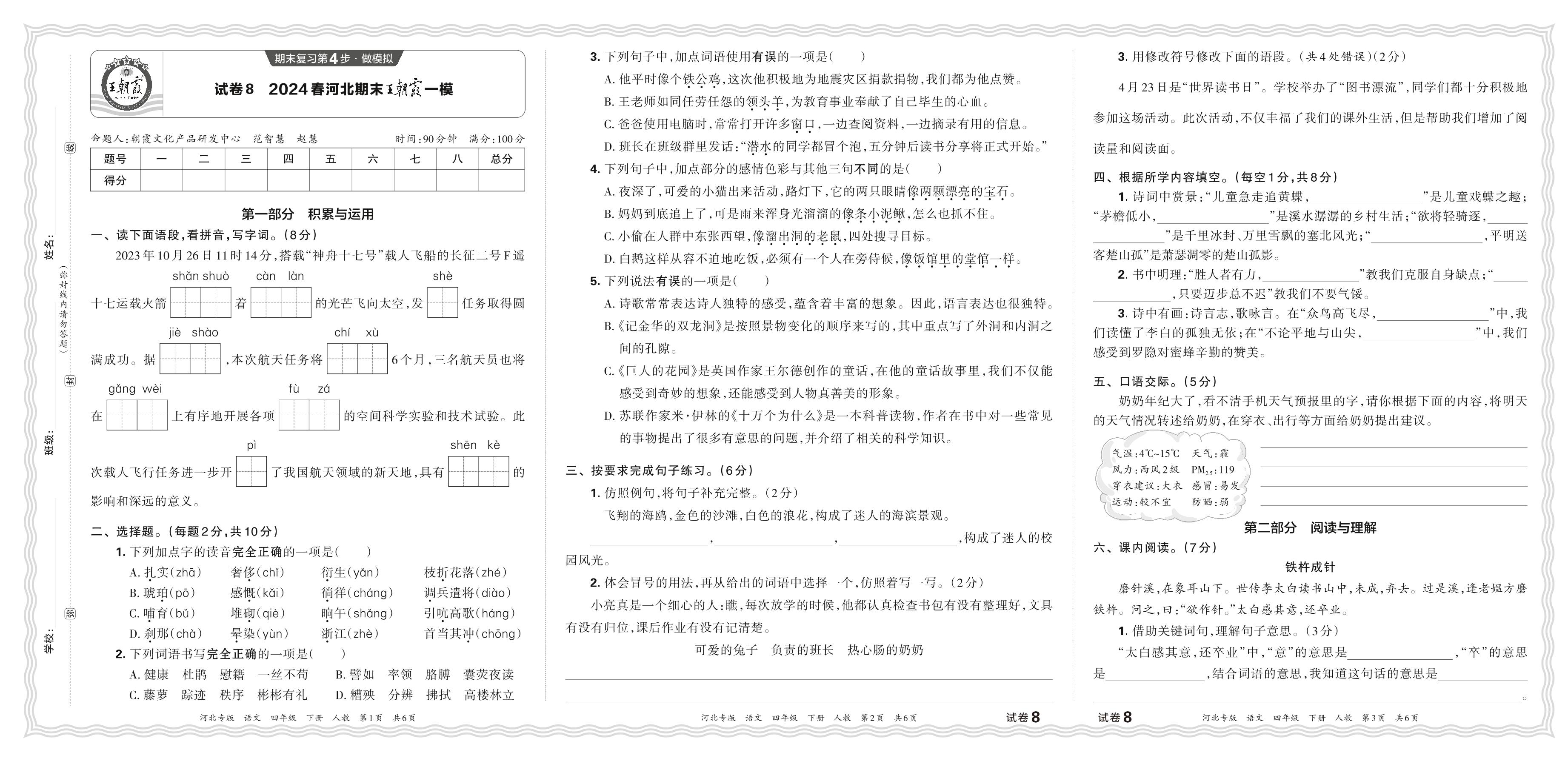 2024春下册四年级语文人教版 河北期末王朝霞一模
