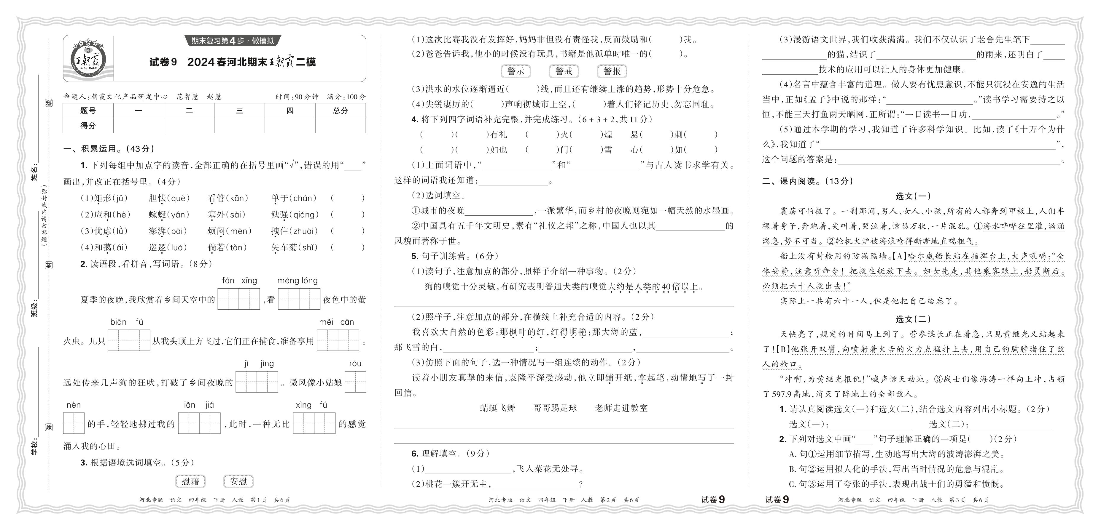 2024春下册四年级语文人教版 河北期末王朝霞二模