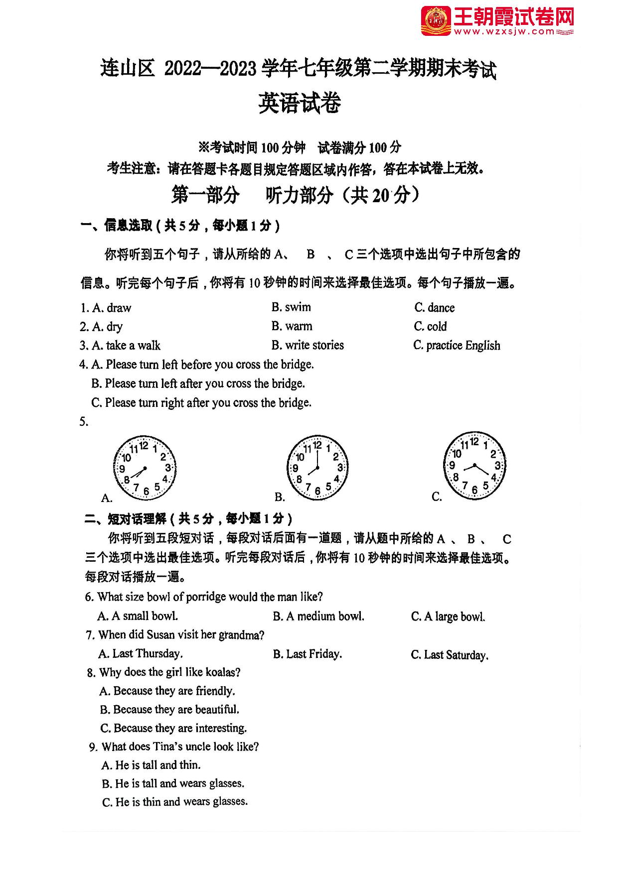 辽宁省葫芦岛市连山区2022-2023学年第二学期期末考试七年级英语(人教版)【无听力音频】