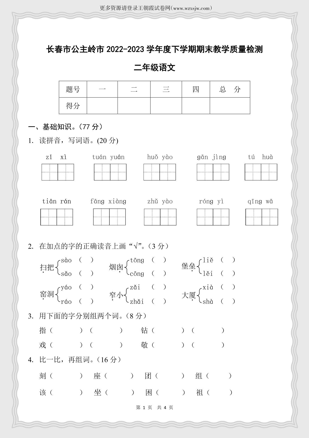 吉林省长春市公主岭市2022-2023学年度下学期期末教学质量检测二年级语文(人教版)