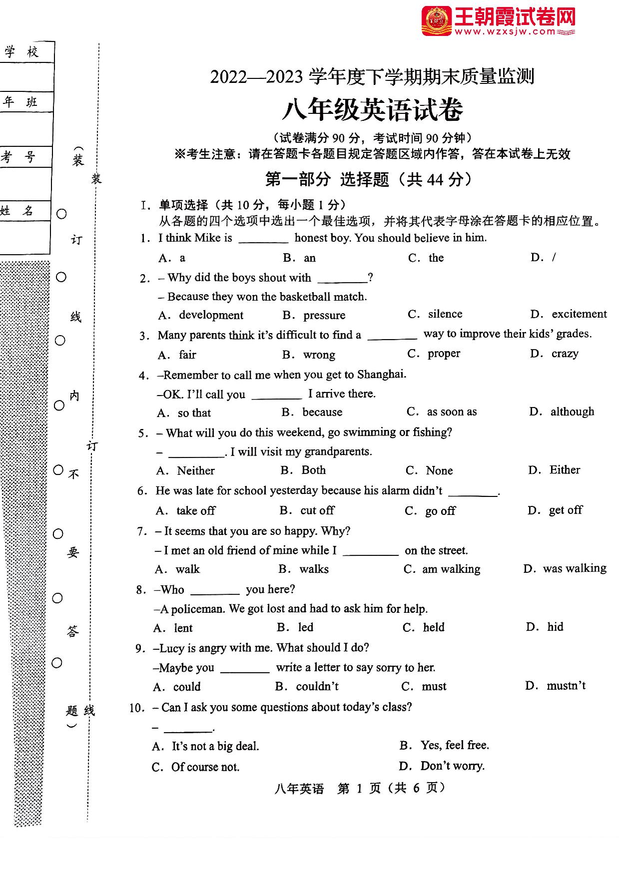 辽宁省辽阳市2022-2023学年度下学期期末质量监测八年级英语(人教版)