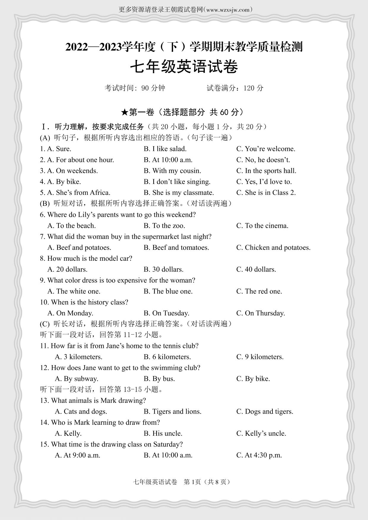 七年级英语人教版下册期末卷