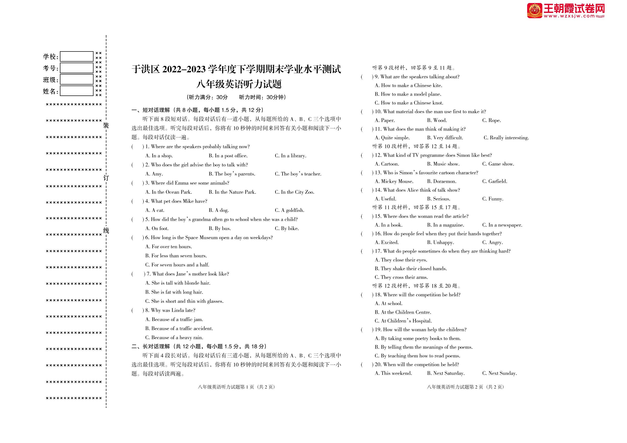 辽宁省沈阳市于洪区2022-2023学年度下学期期末学业水平测试八年级英语(人教版)【无听力音频】