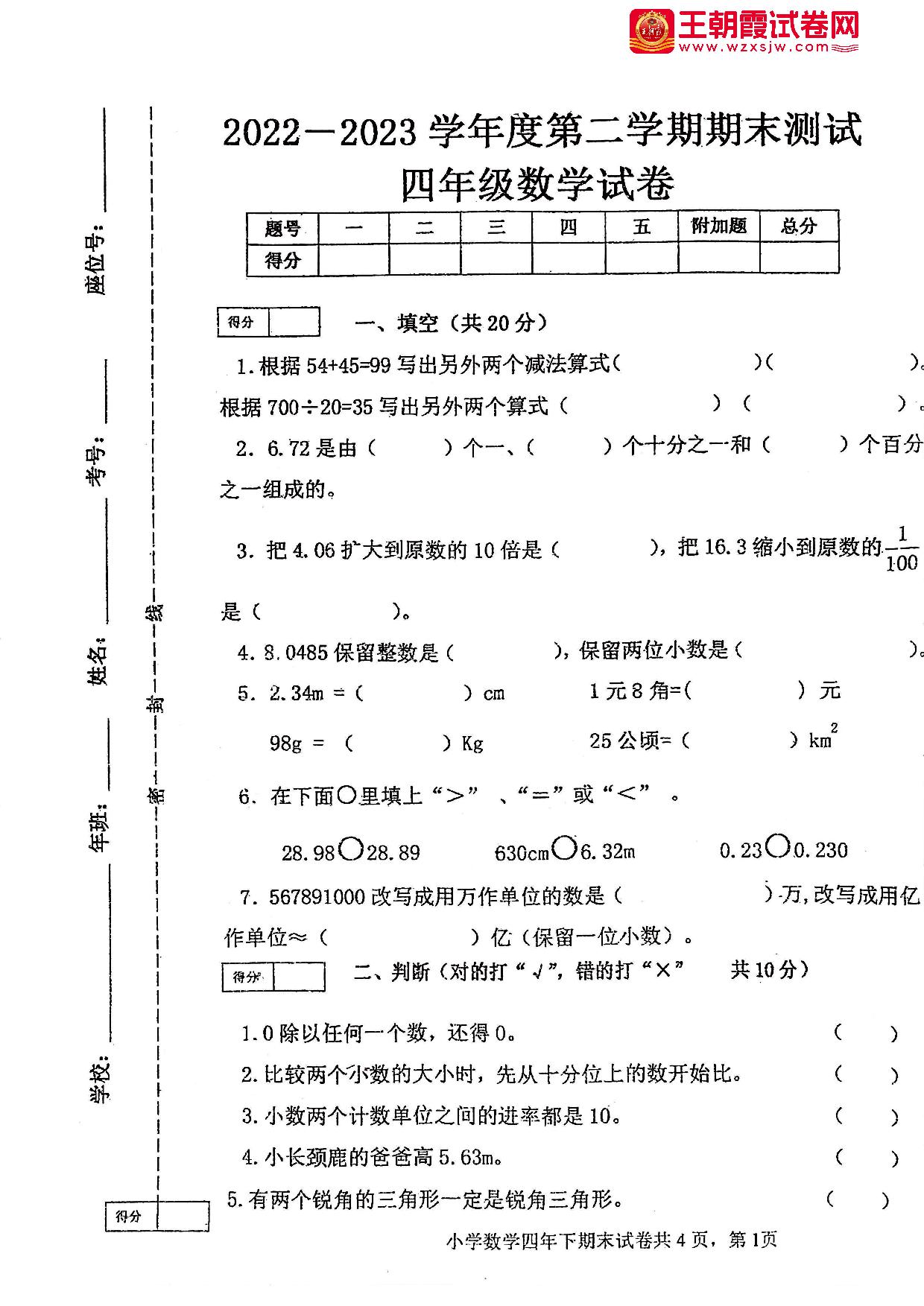 吉林省白城市通榆县2022-2023学年度第二学期期末测试四年级数学(人教版)