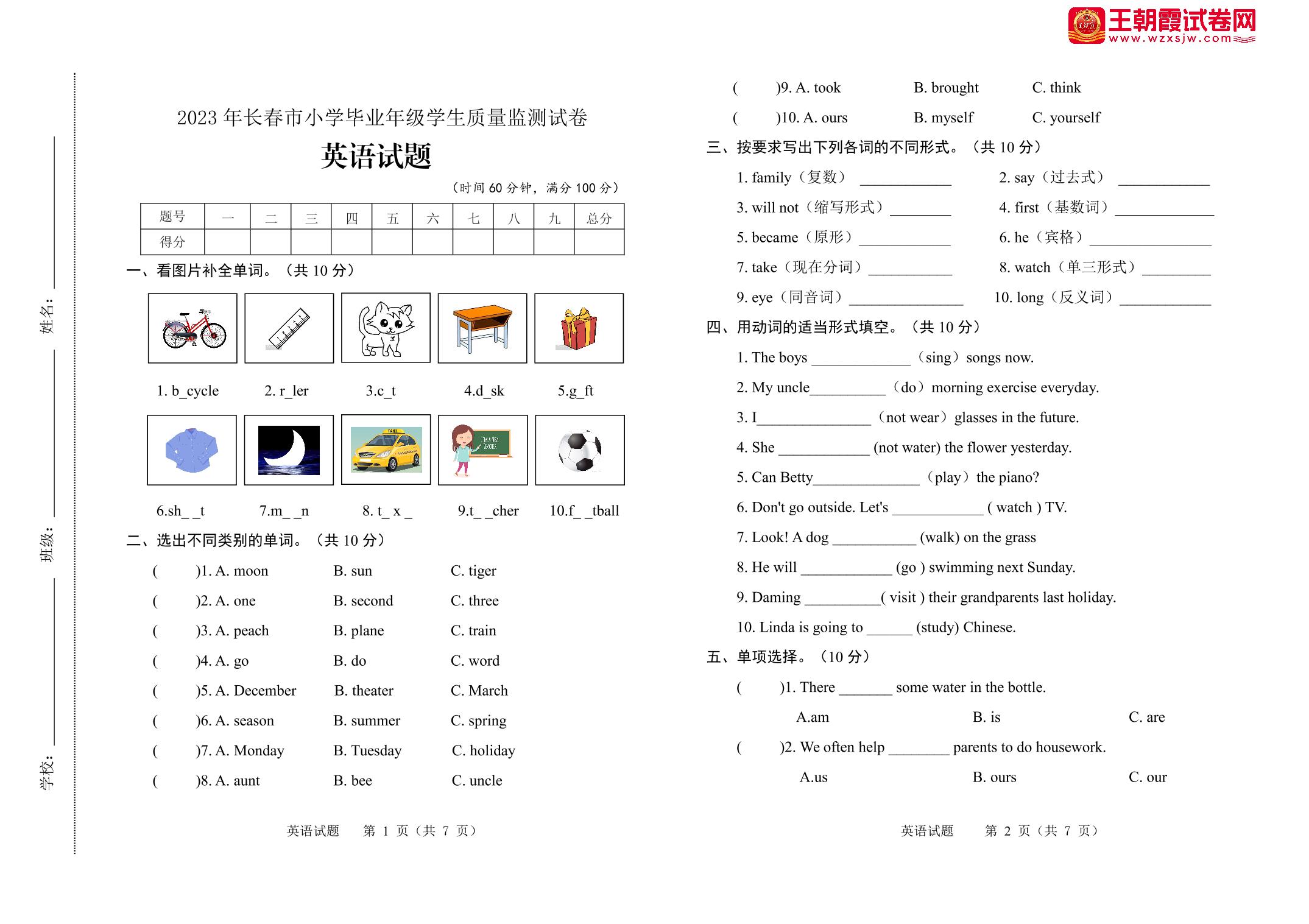 吉林省长春市2022-2023学年小学毕业年级学生质量监测英语(外研版)