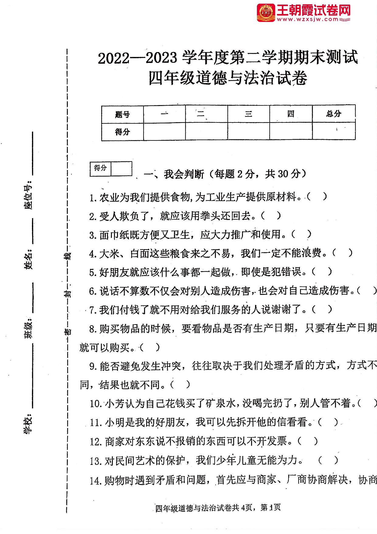 吉林省白城市通榆县2022-2023学年度第二学期期末测试四年级道德与法治(人教版)