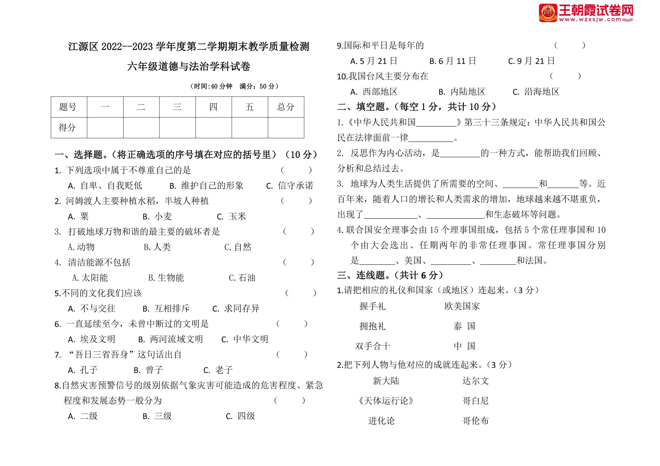 吉林省白山市江源区2022-2023学年度第二学期期末教学质量检测六年级道德与法治(人教版)