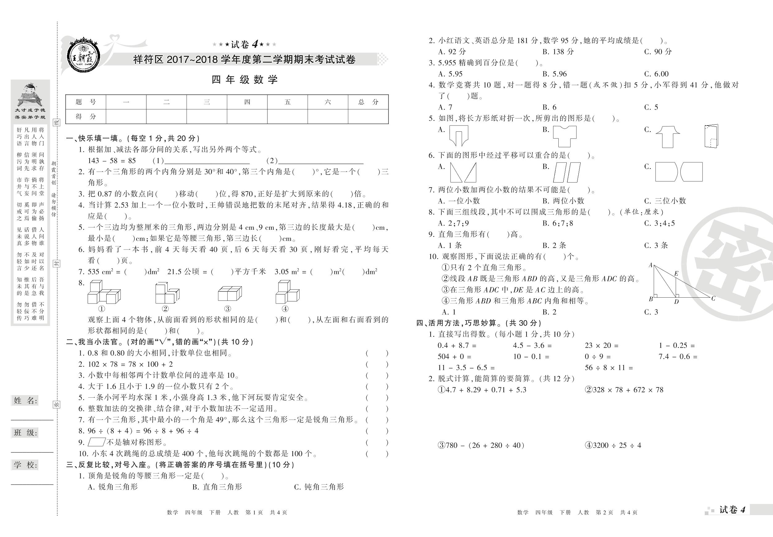 2017-2018学年第二学期开封市祥符区四年级数学试卷(人教版)【4】