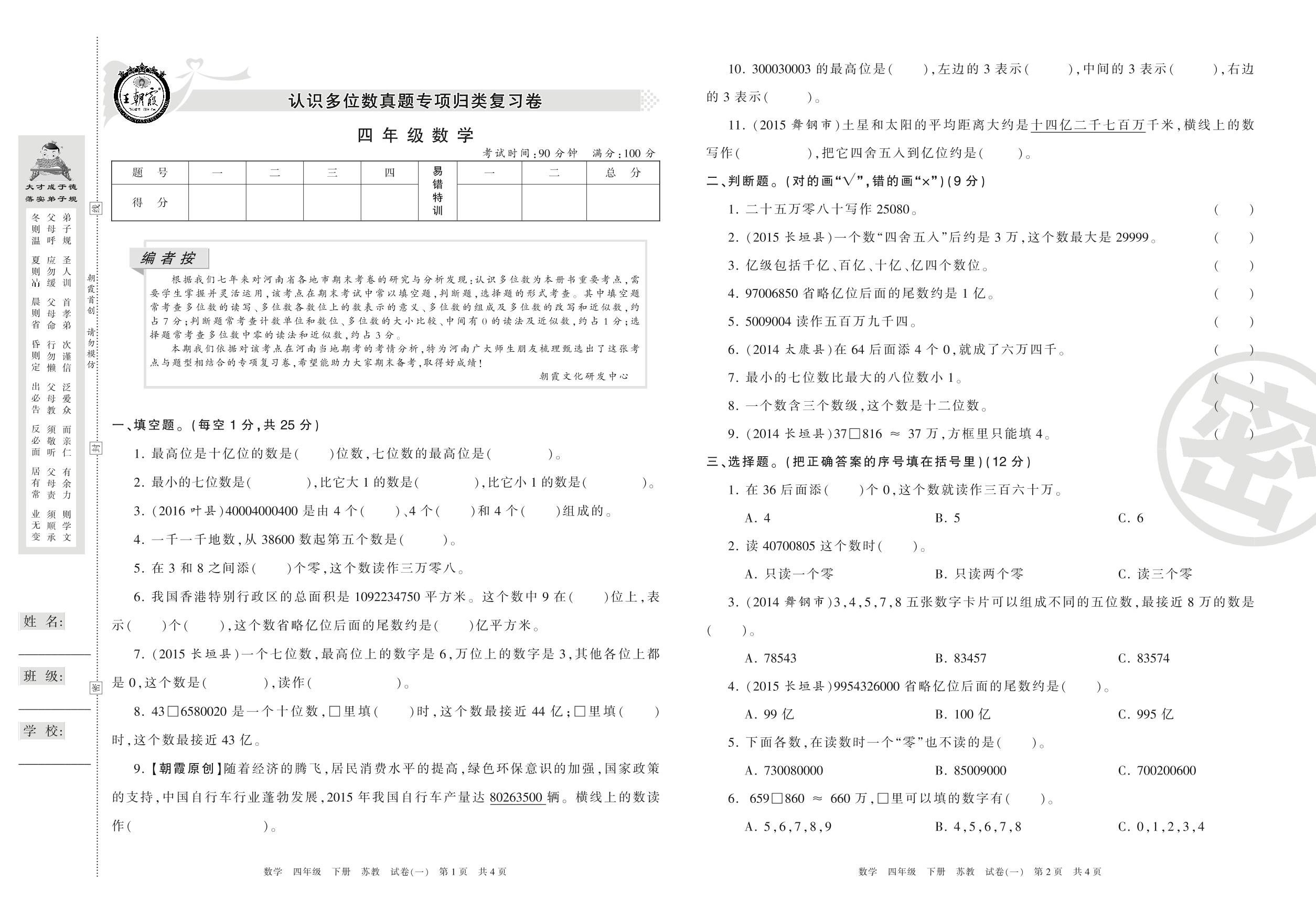 王朝霞期末专项卷四年级下册数学(苏教版)_R210804150204【1】