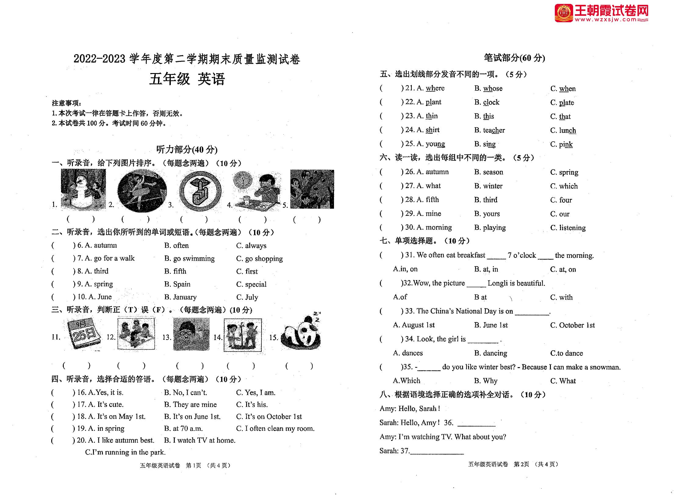 五年级英语人教PEP版(三起始)下册期末卷