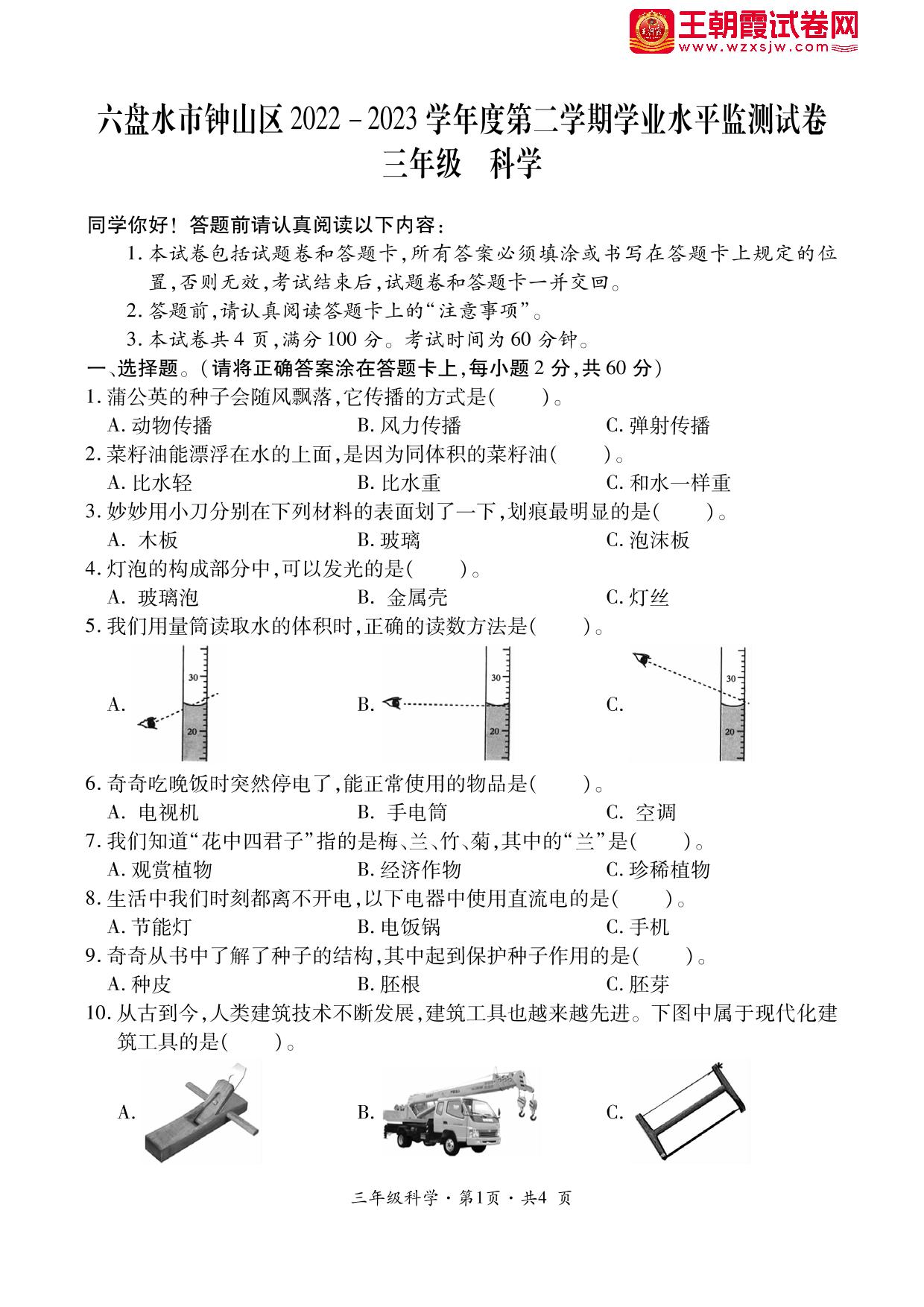 贵州省六盘水市钟山区2022-2023学年度第二学期期末学业水平监测试卷三年级科学(大象版)