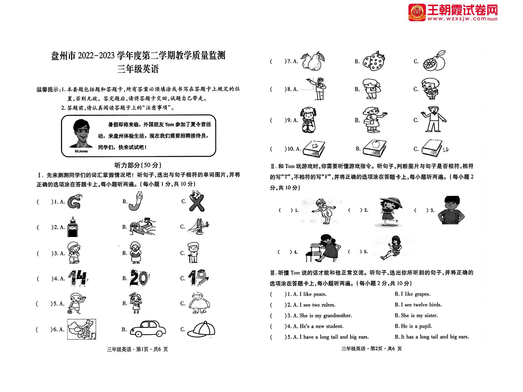贵州省六盘水市盘州市2022-2023学年度第二学期期末教学质量监测试卷三年级英语(人教PEP版)【无听力音频】