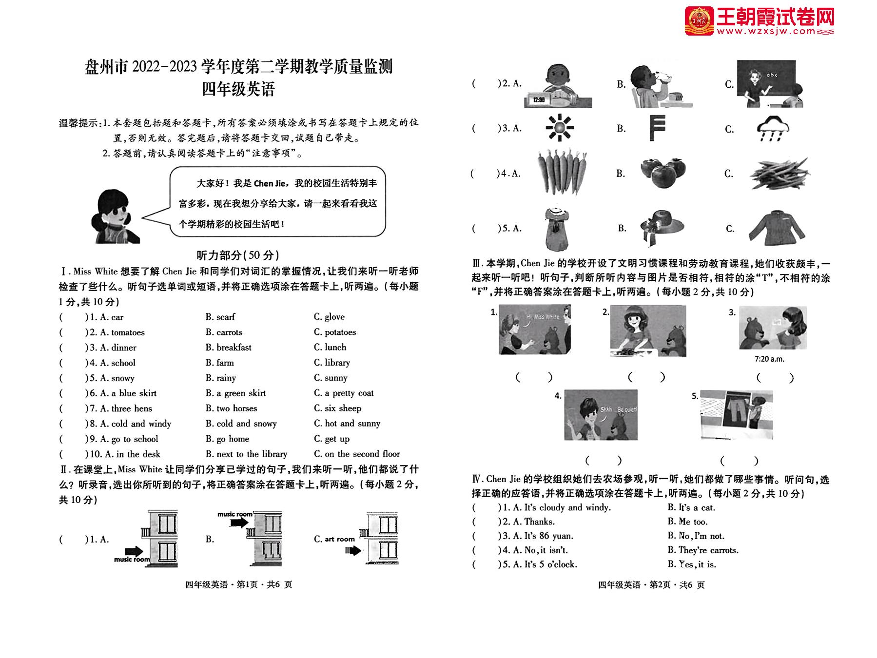 贵州省六盘水市盘州市2022-2023学年度第二学期期末教学质量监测试卷四年级英语(人教PEP版)【无听力音频】