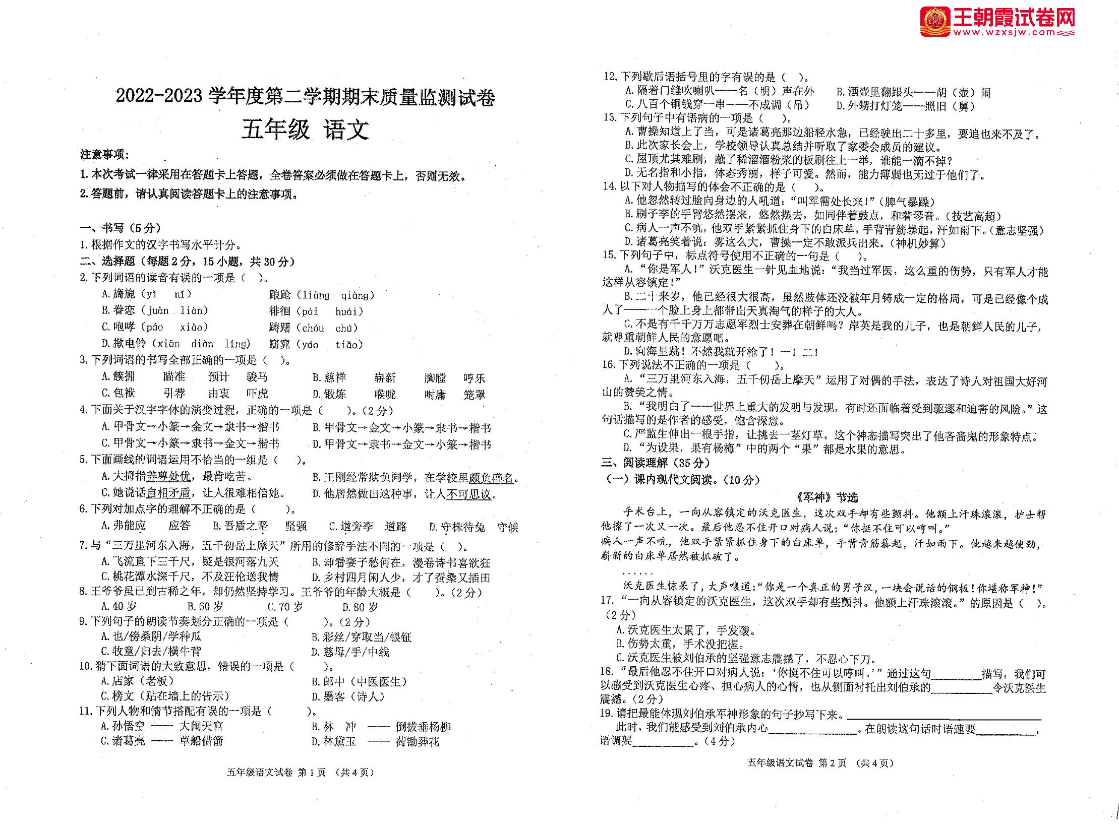 五年级语文人教版下册期末卷