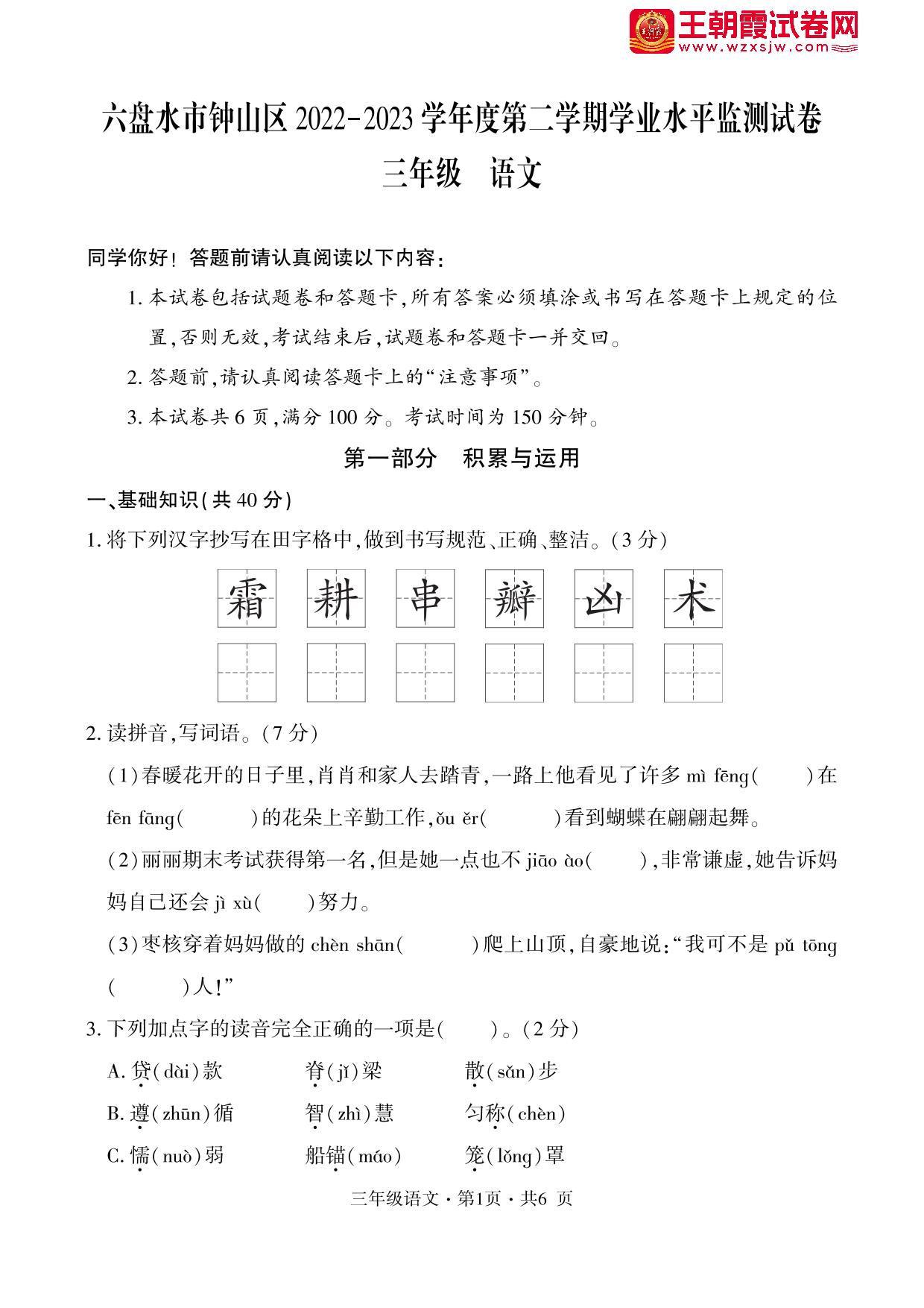 贵州省六盘水市钟山区2022-2023学年度第二学期期末学业水平监测试卷三年级语文(人教版)