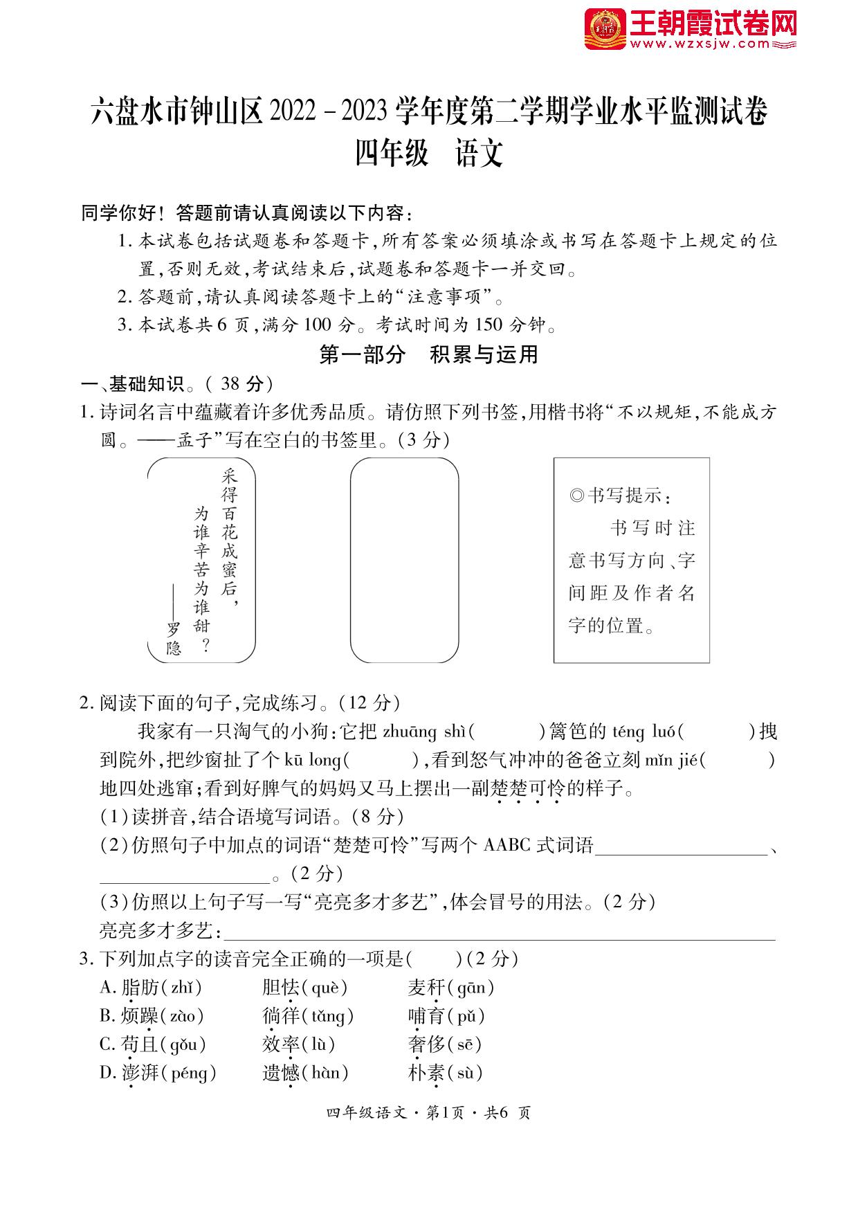 贵州省六盘水市钟山区2022-2023学年度第二学期期末学业水平监测试卷四年级语文(人教版)