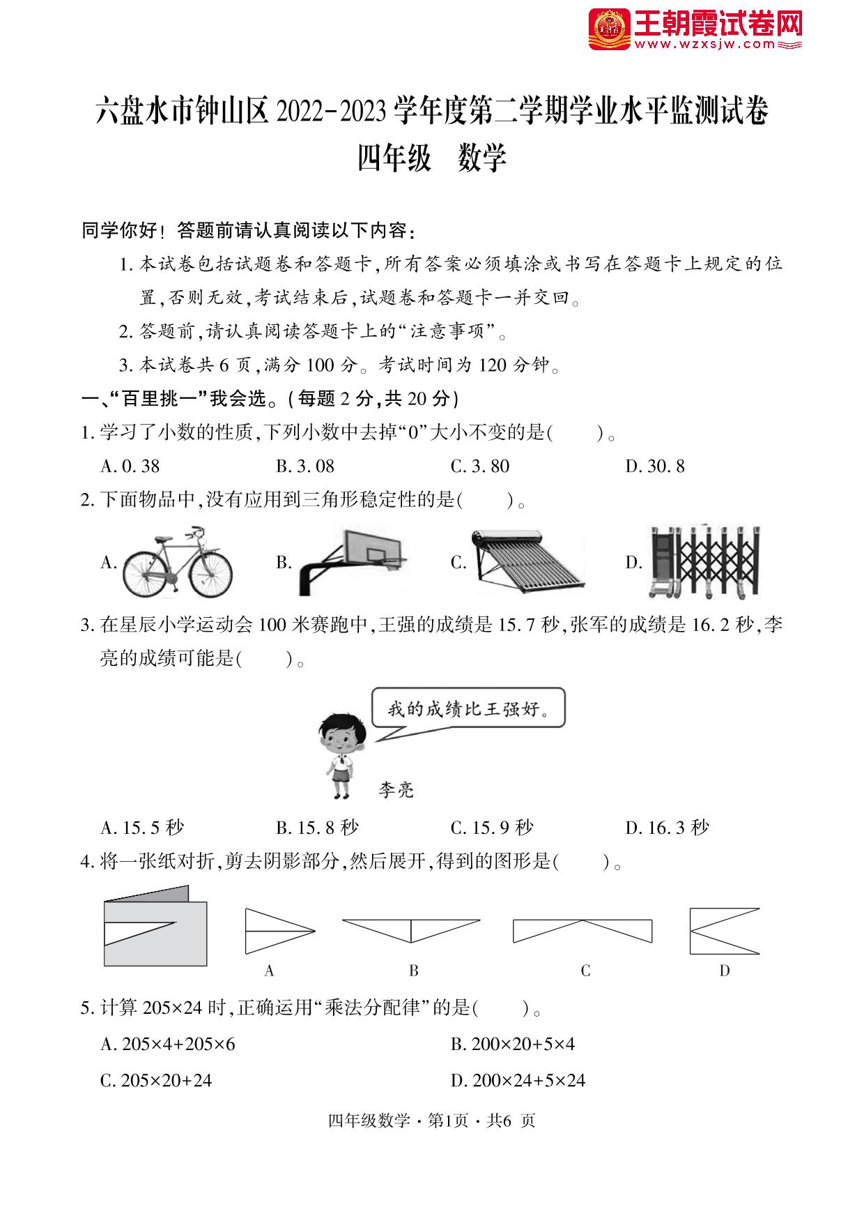 贵州省六盘水市钟山区2022-2023学年度第二学期期末学业水平监测试卷四年级数学(人教版)