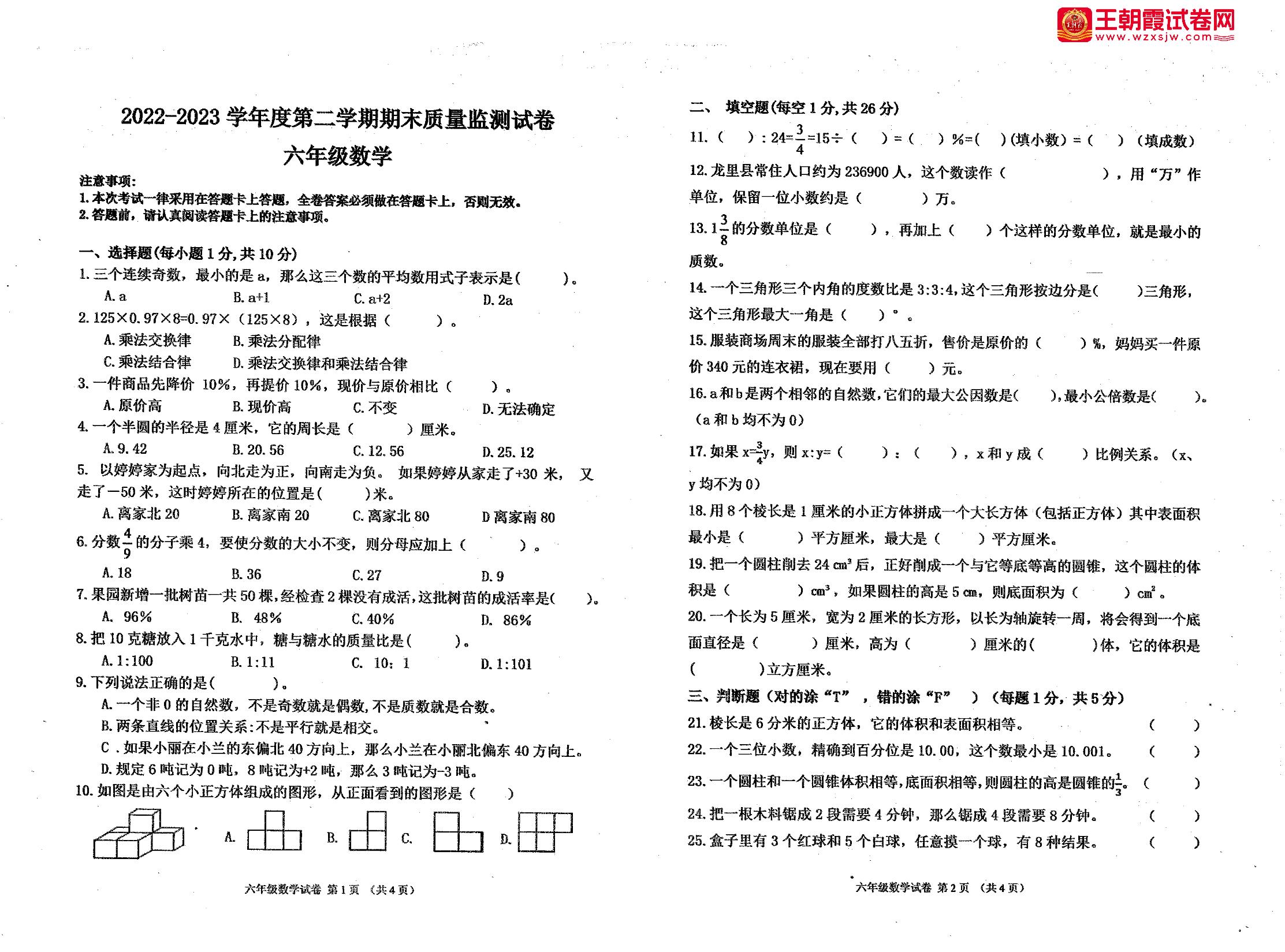 贵州省黔南布依族苗族自治州龙里县2022-2023学年度第二学期期末质量监测试卷六年级数学(人教版)