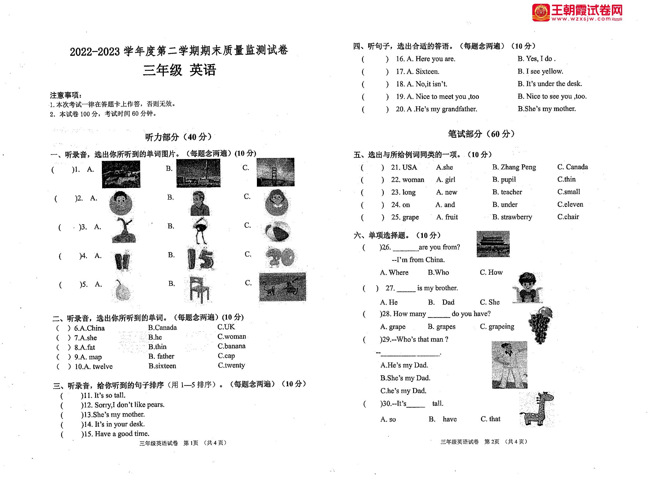 三年级英语人教PEP版(三起始)下册期末卷