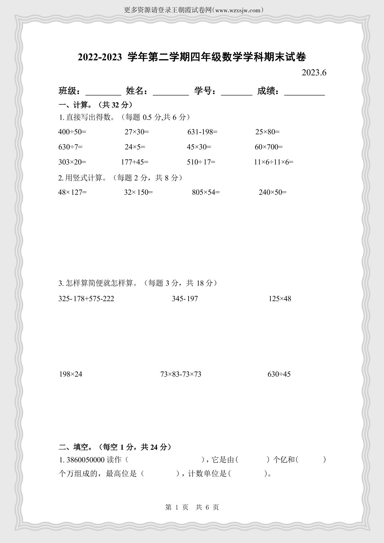 江苏省南京市栖霞区2022-2023学年第二学期期末试卷四年级数学(苏教版)