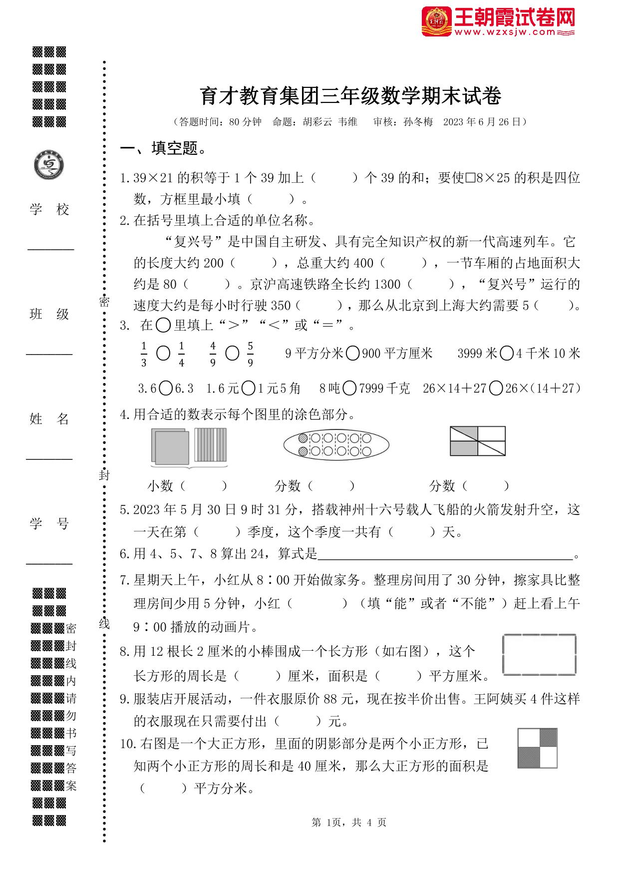 江苏省扬州市育才教育集团2022-2023学年第二学期期末试卷三年级数学(苏教版)
