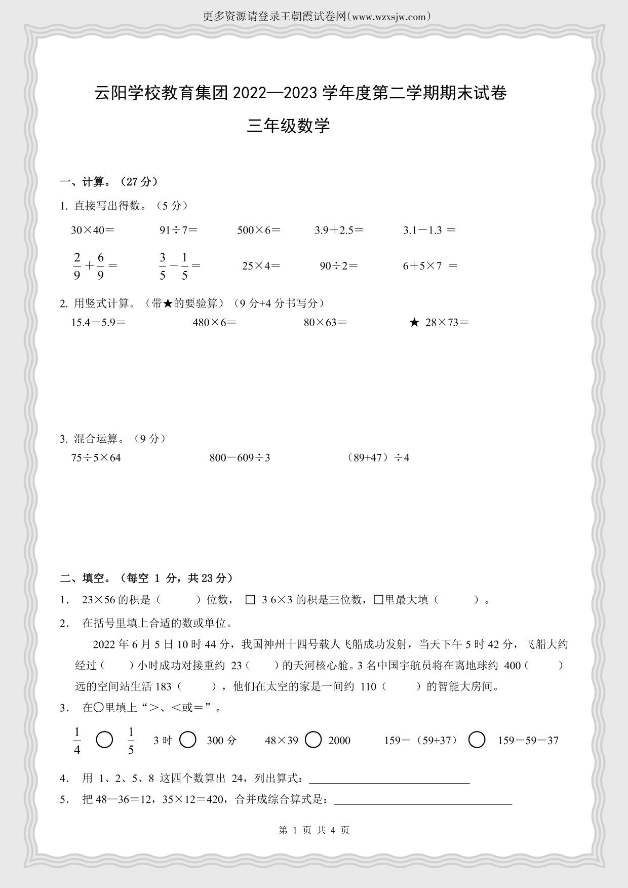 江苏省镇江市丹阳市云阳学校教育集团2022-2023学年第二学期期末试卷三年级数学(苏教版)