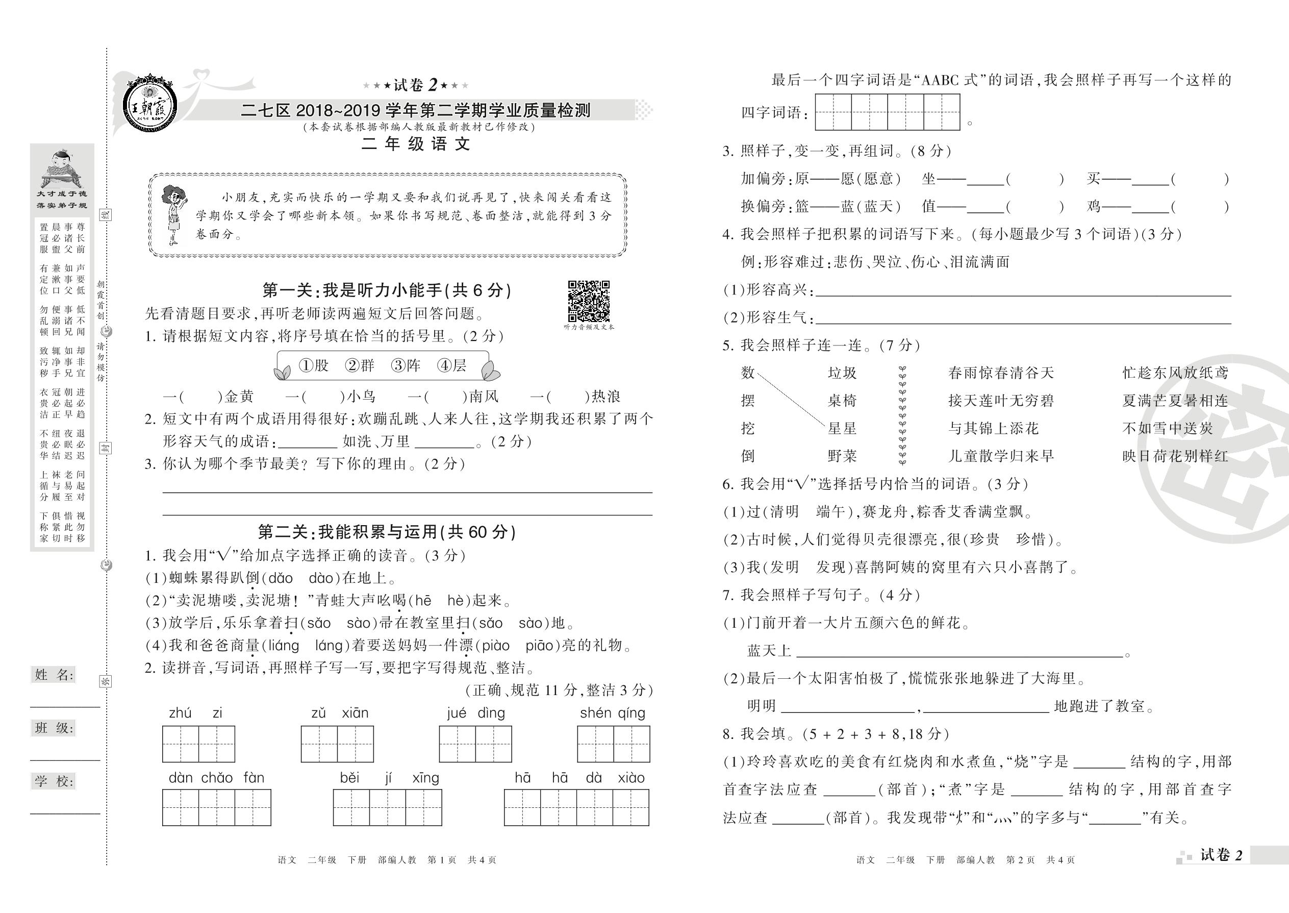 2018-2019学年第二学期郑州市二七区二年级语文试卷(人教版)_R21080170056【2】