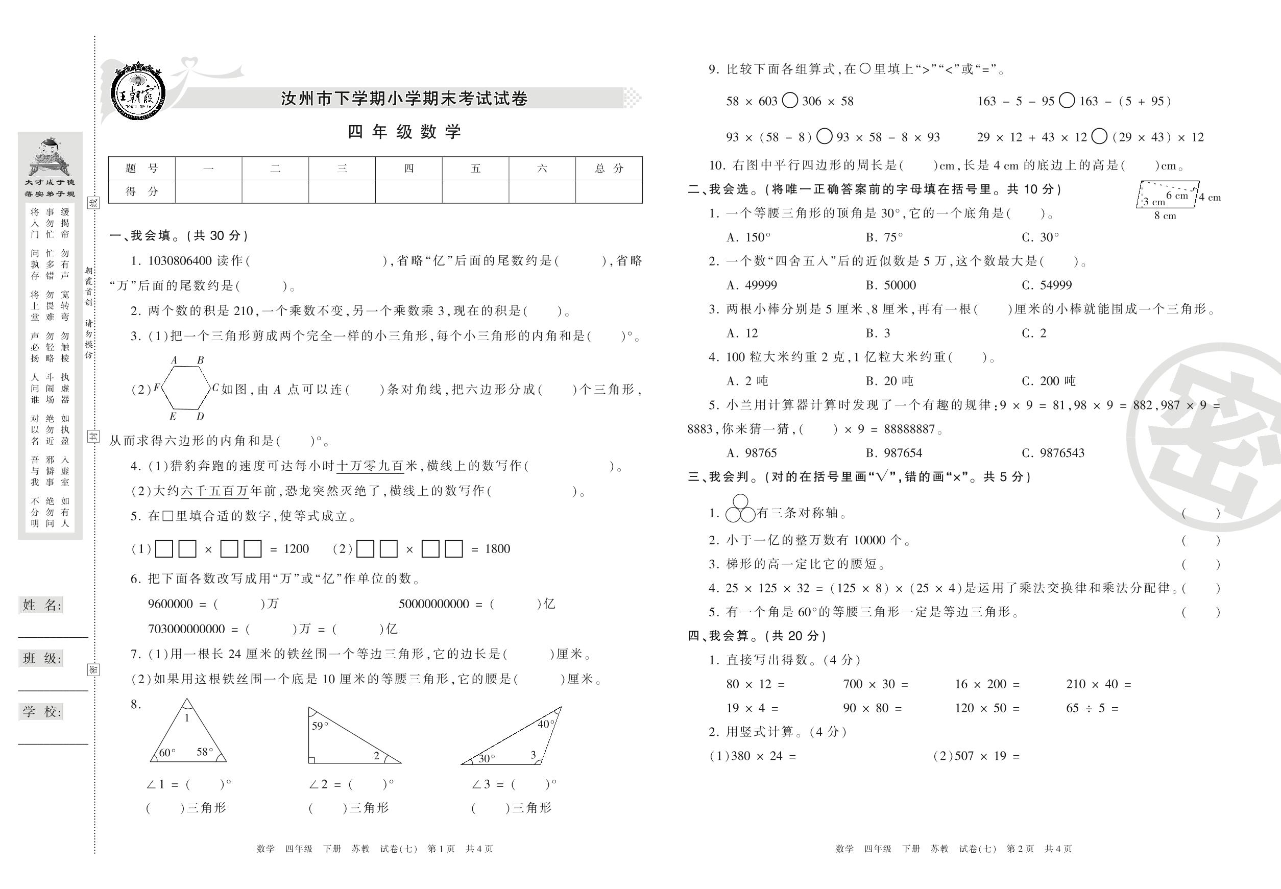2015-2016学年第二学期汝州市四年级数学试卷(苏教版)【7】