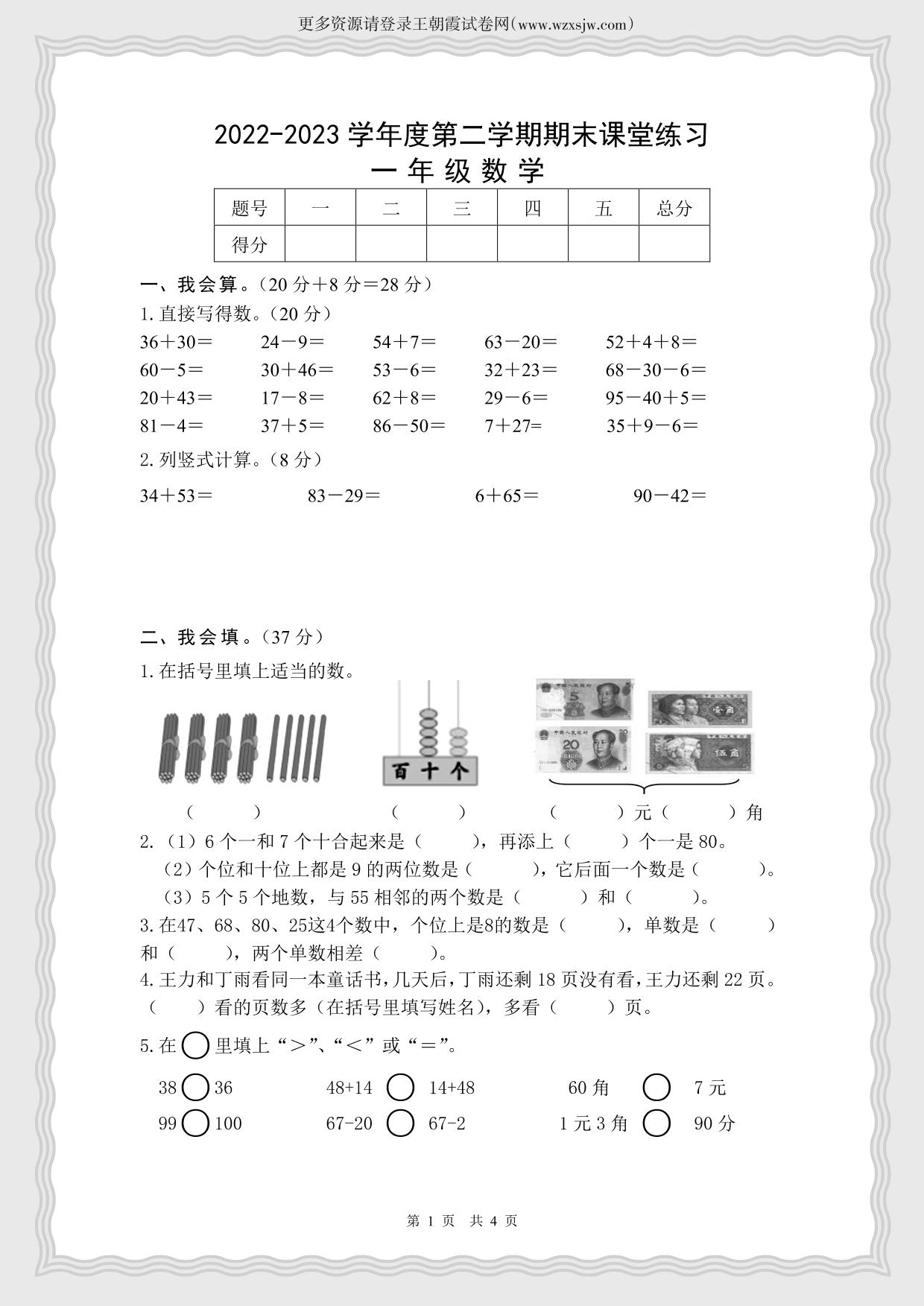 江苏省盐城市盐都区2022-2023学年第二学期期末课堂练习一年级数学(苏教版)