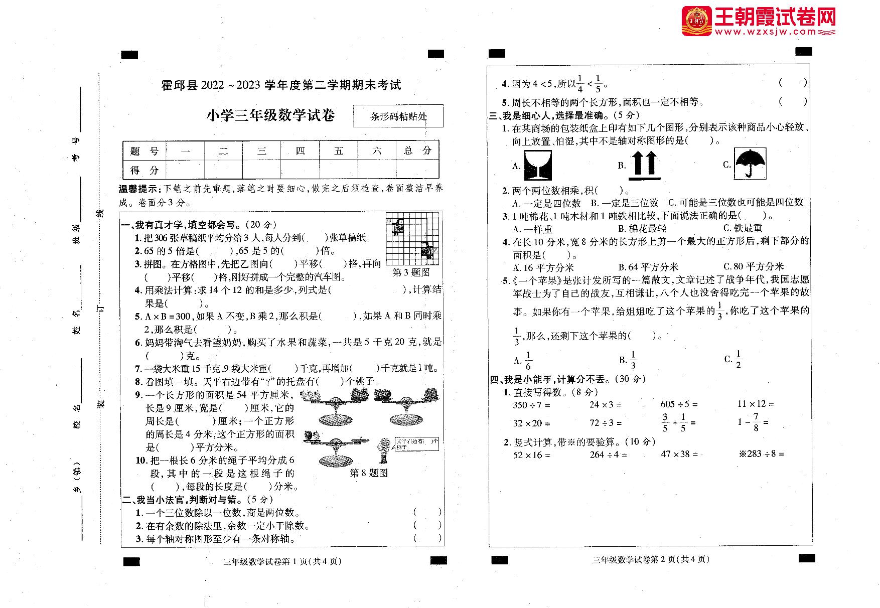 安徽省六安市霍邱县2022-2023学年度第二学期期末考试三年级数学(苏教版)