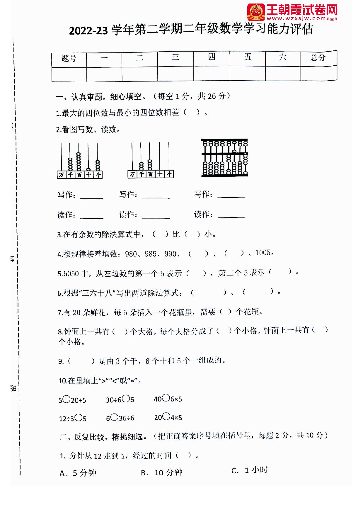 安徽省芜湖市无为市2022-2023学年第二学期期末学习能力评估二年级数学(苏教版)