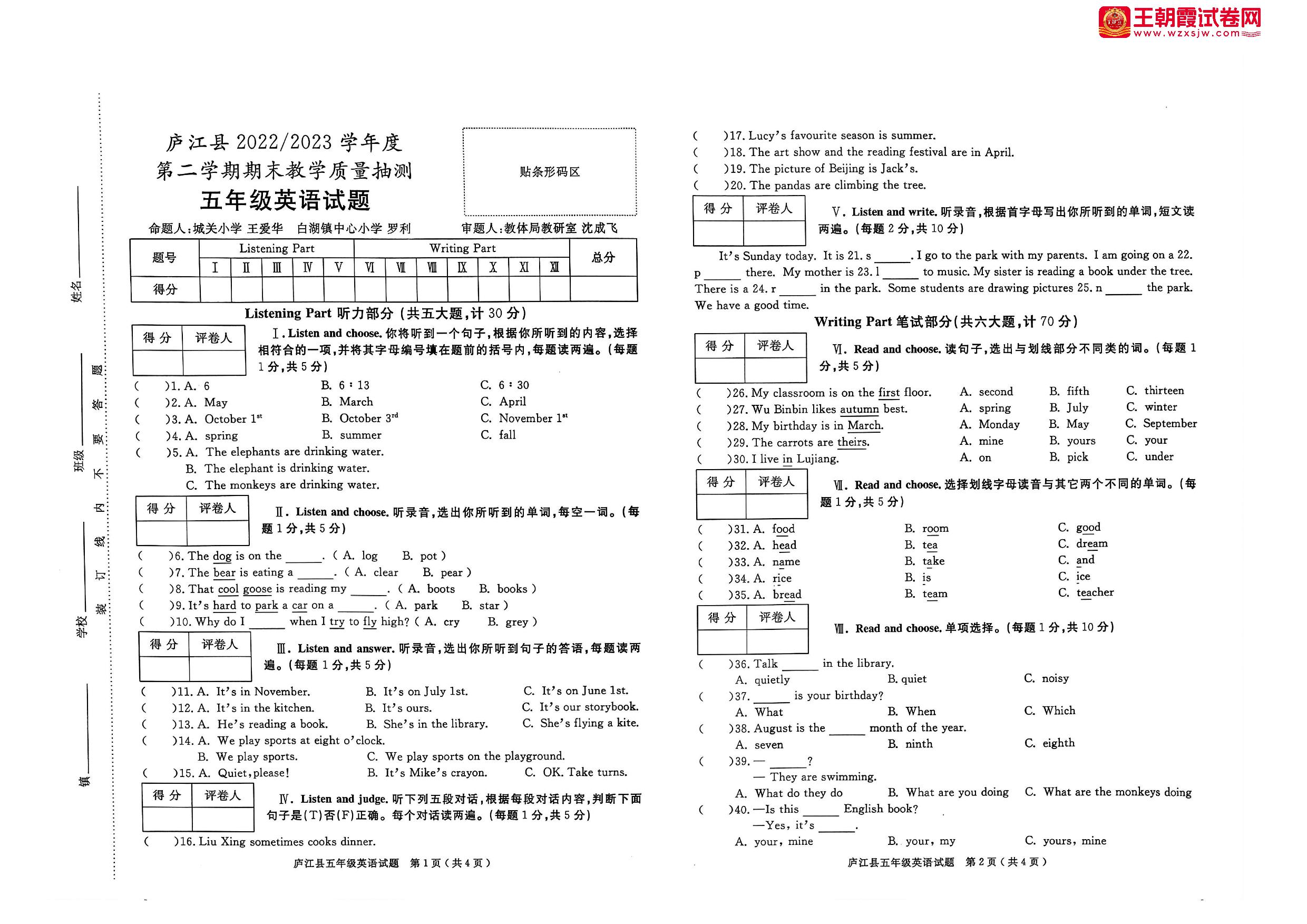 安徽省合肥市庐江县2022-2023学年度第二学期期末教学质量抽测五年级英语(人教PEP版)