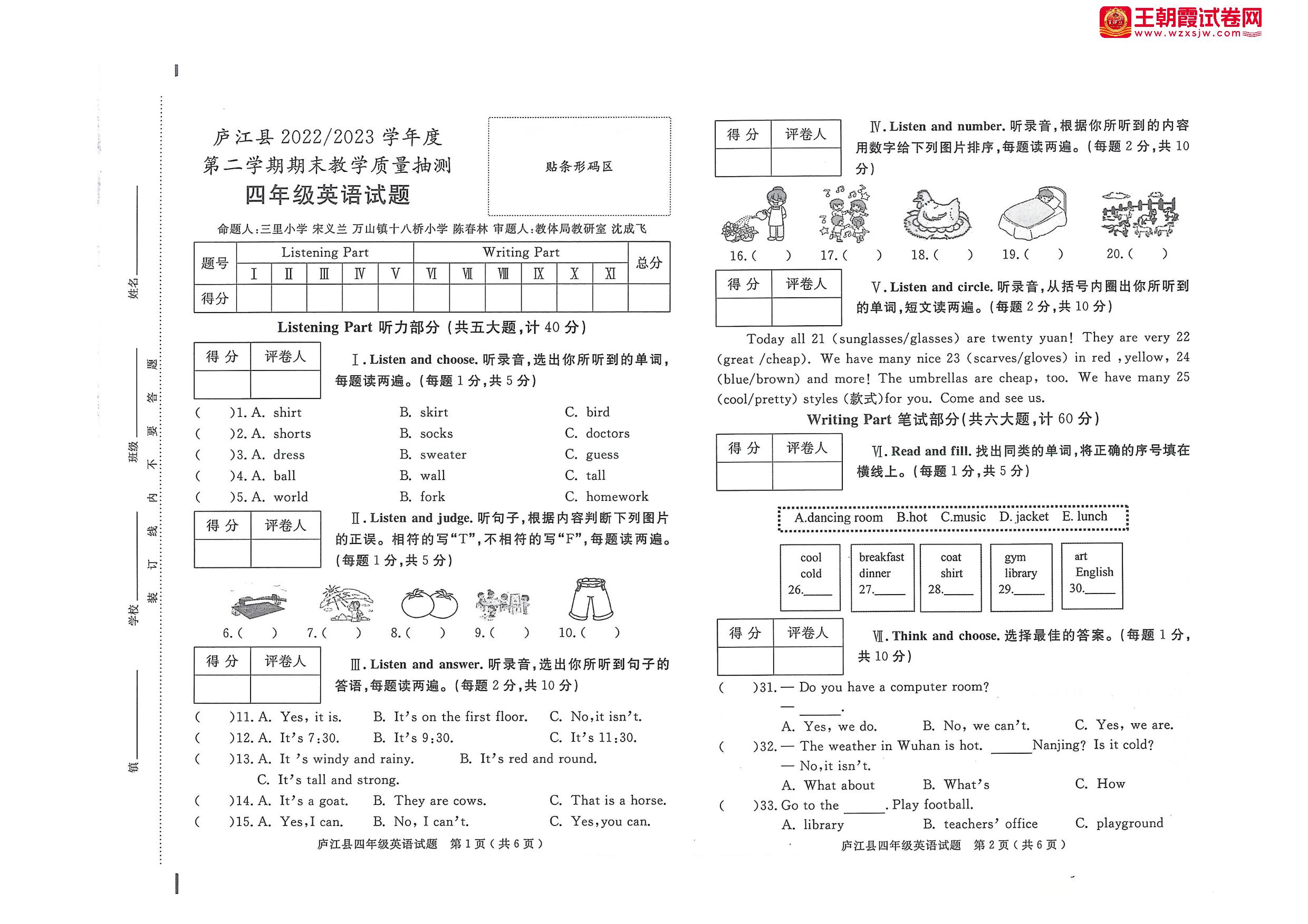 安徽省合肥市庐江县2022-2023学年度第二学期期末教学质量抽测四年级英语(人教PEP版)