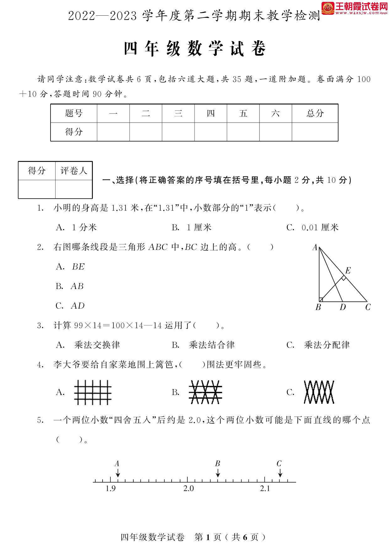吉林省吉林市磐石市2022-2023学年度第二学期期末教学检测四年数学(人教版)