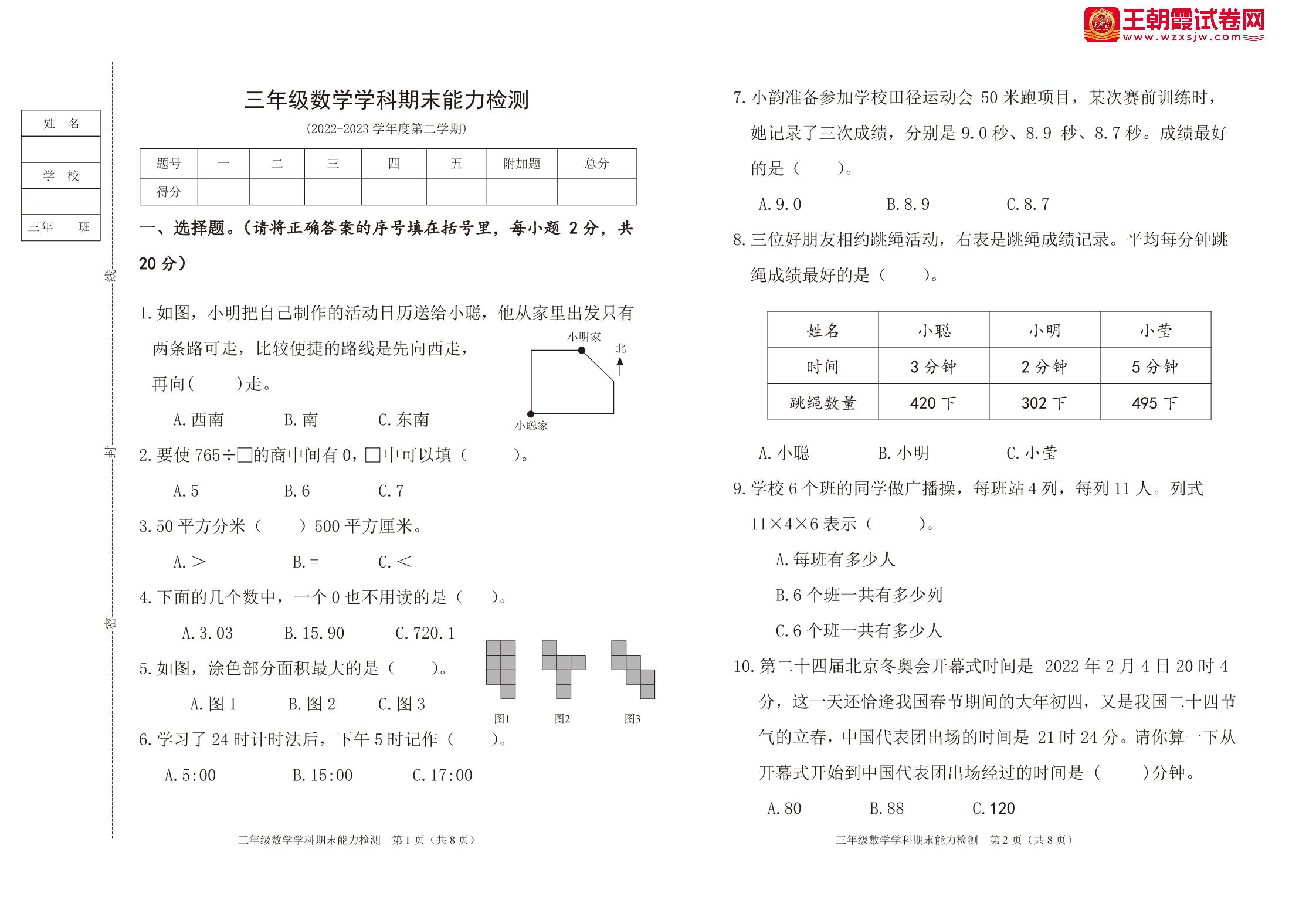 吉林省四平市铁西区2022-2023学年度第二学期期末能力检测三年级数学(人教版)
