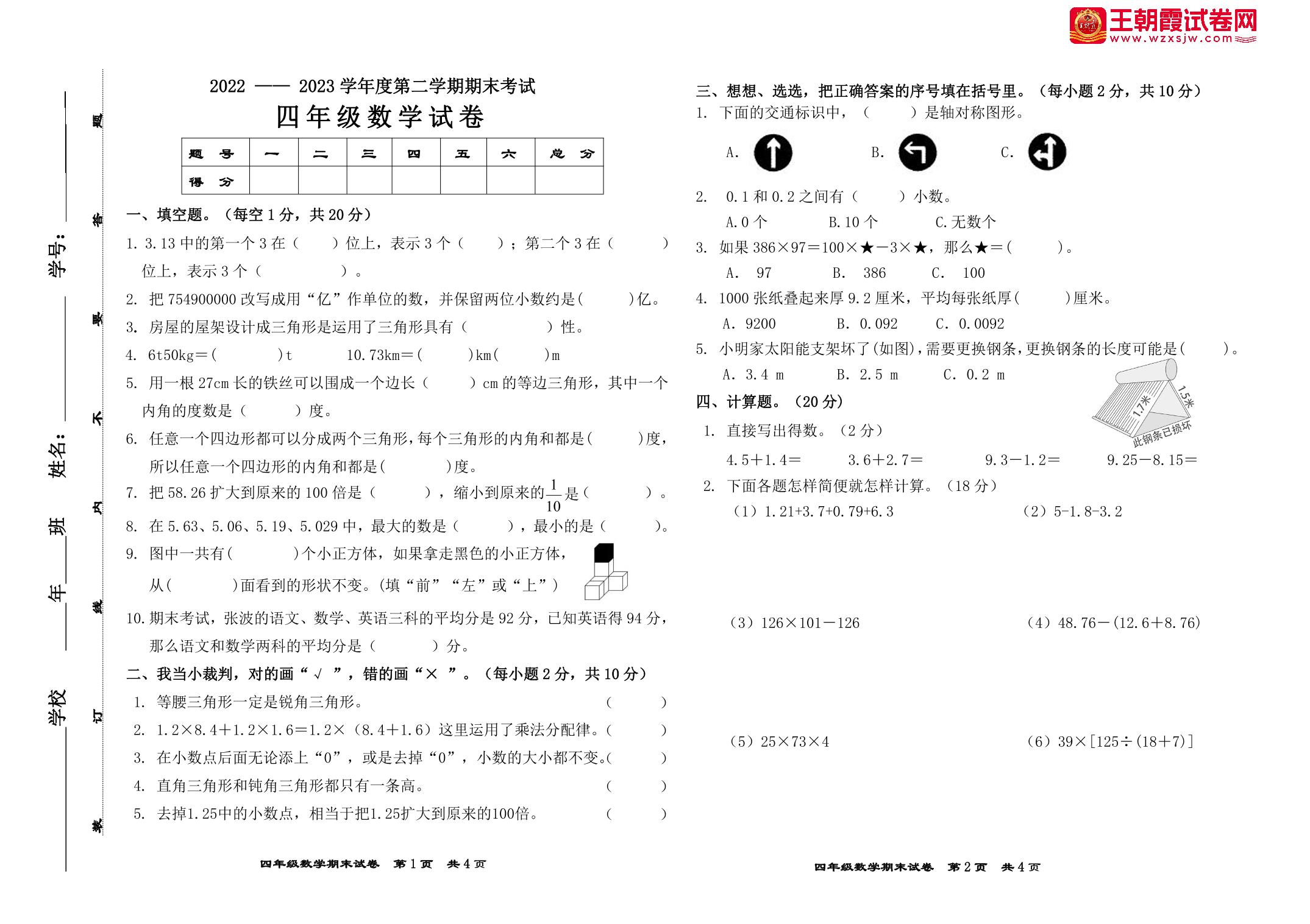 吉林省长春市公主岭市2022-2023学年度第二学期期末考试四年级数学(北师版)