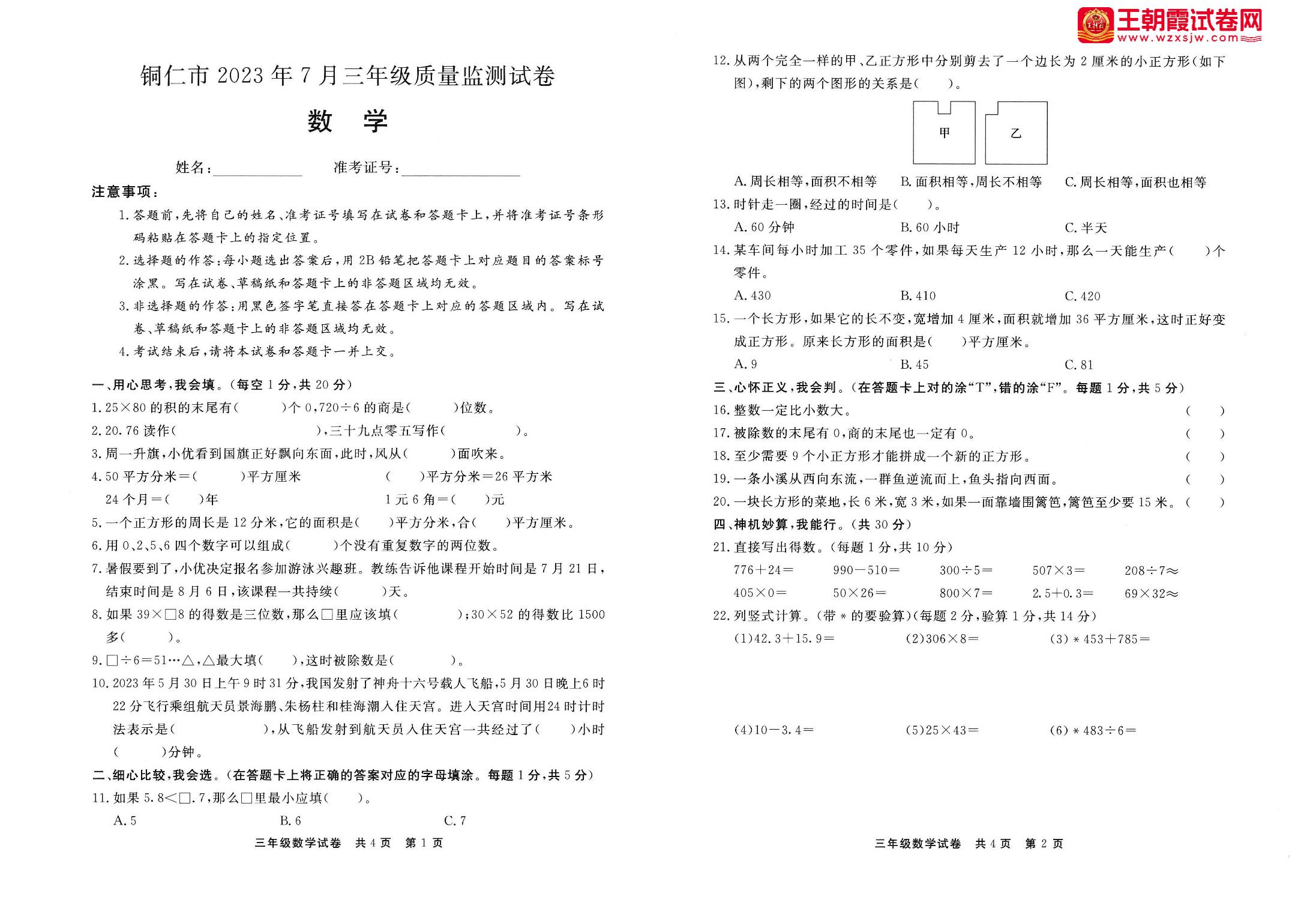贵州省铜仁市2022-2023学年度第二学期期末质量监测试卷三年级数学(人教版)