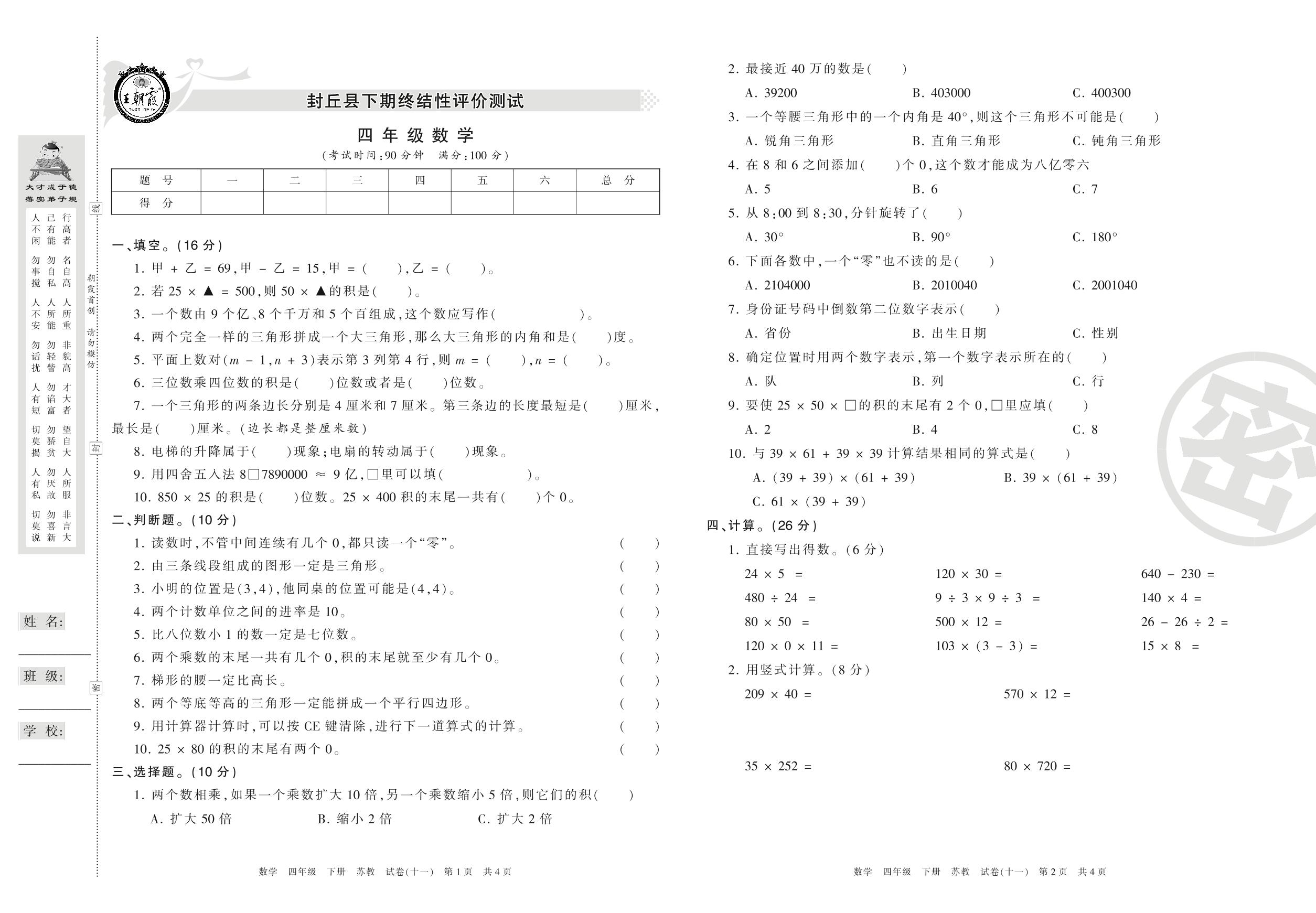 2015-2016学年第二学期新乡市封丘县四年级数学试卷(苏教版)【11】