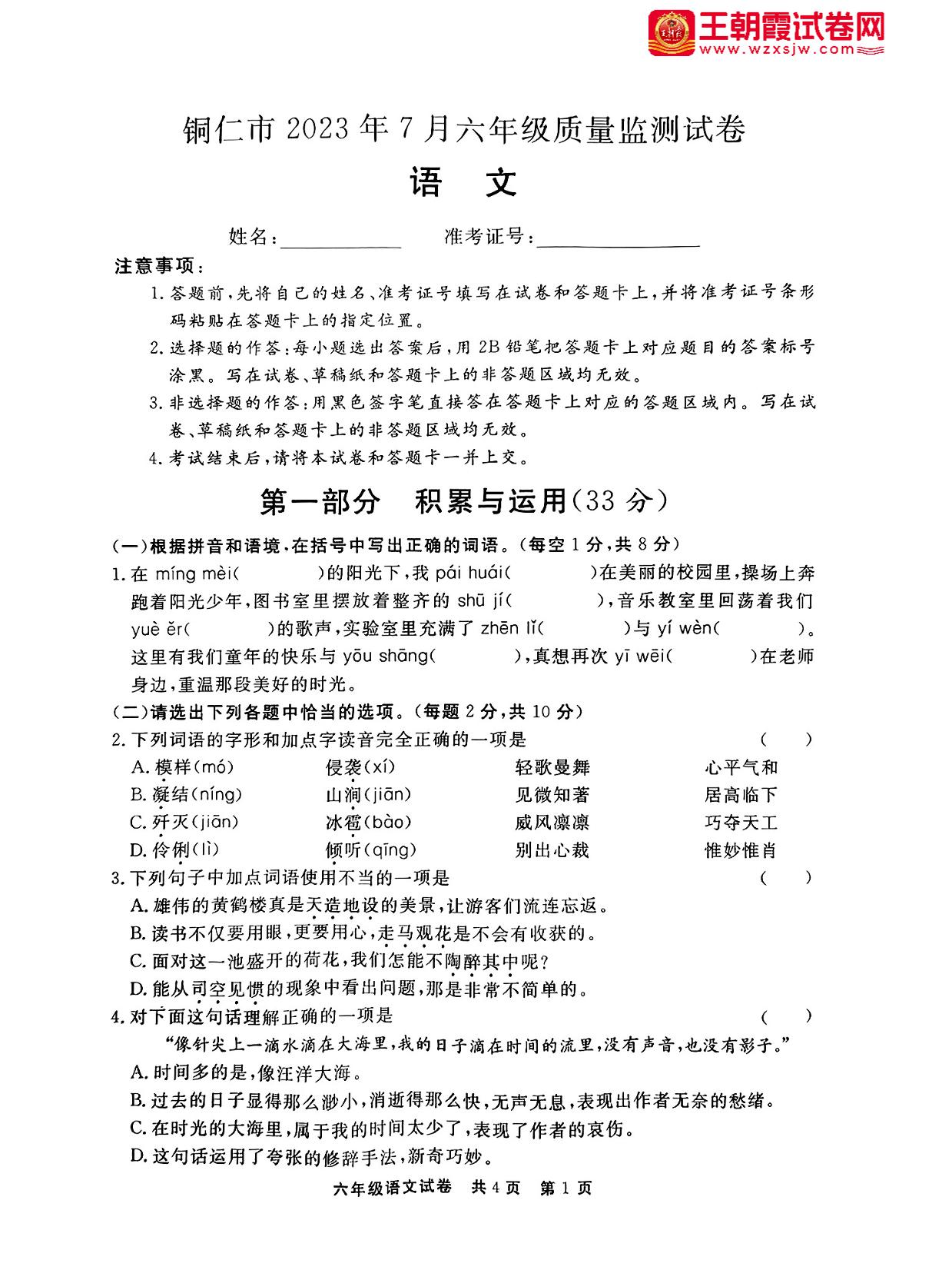 贵州省铜仁市2022-2023学年度第二学期期末质量监测试卷六年级语文(人教版)
