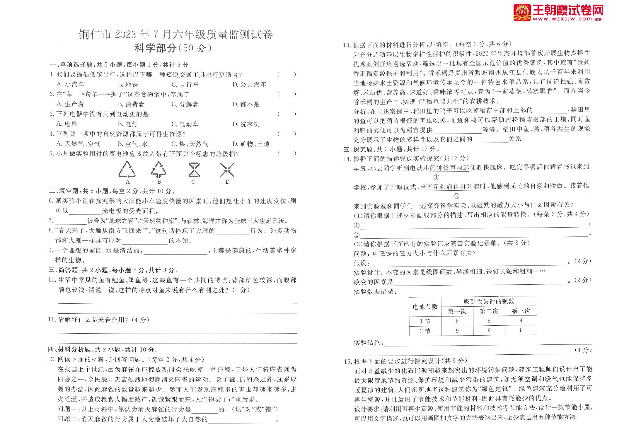 贵州省铜仁市2022-2023学年度第二学期期末质量监测试卷六年级科学(苏教版)