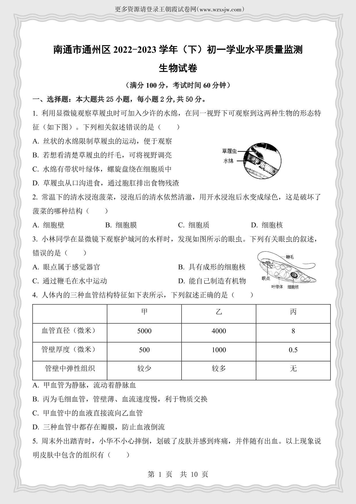 江苏省南通市通州区2022-2023学年第二学期期末学业水平质量监测七年级生物(苏科版)