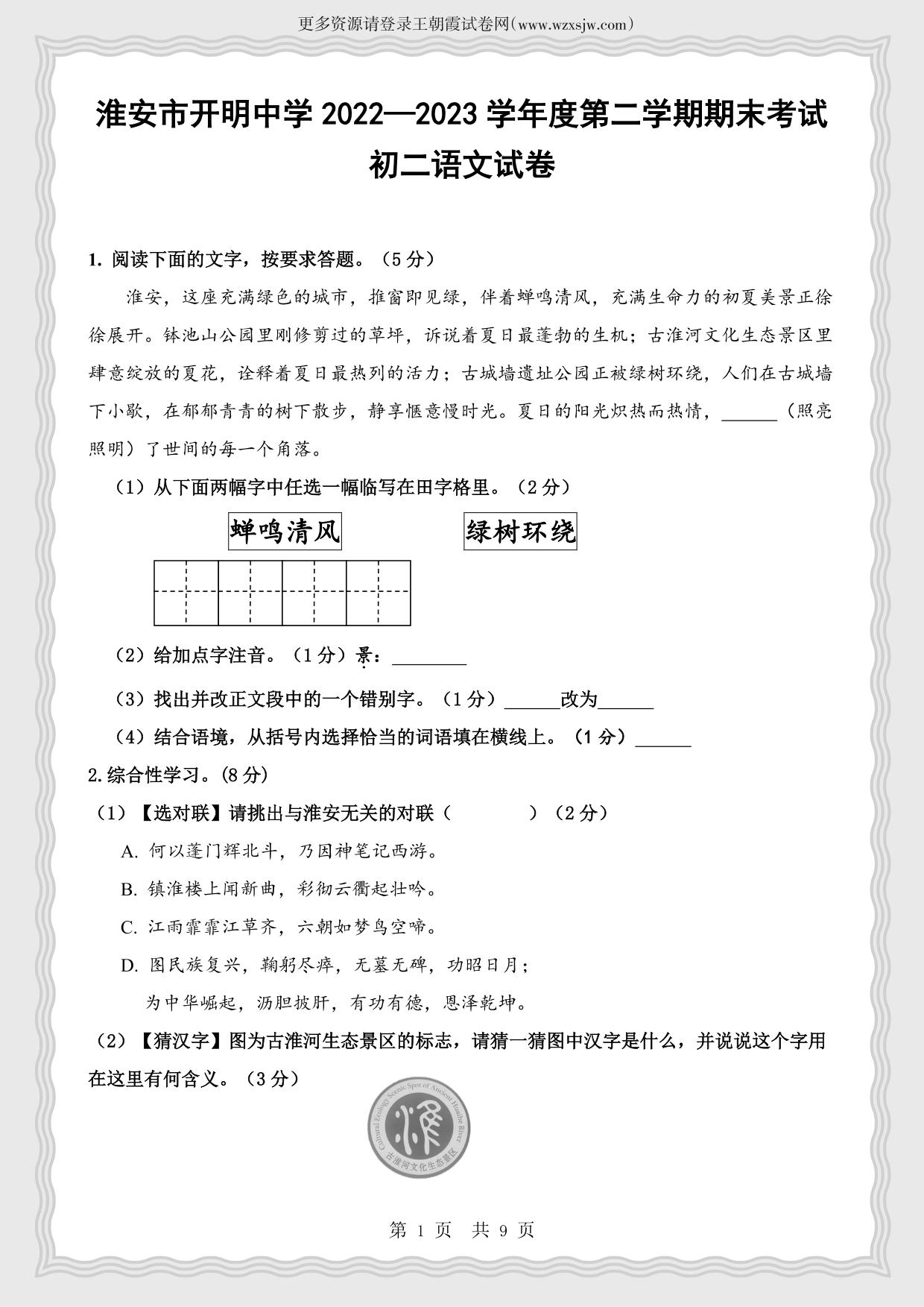 江苏省淮安市开明中学2022-2023学年第二学期期末试卷八年级语文(人教版)